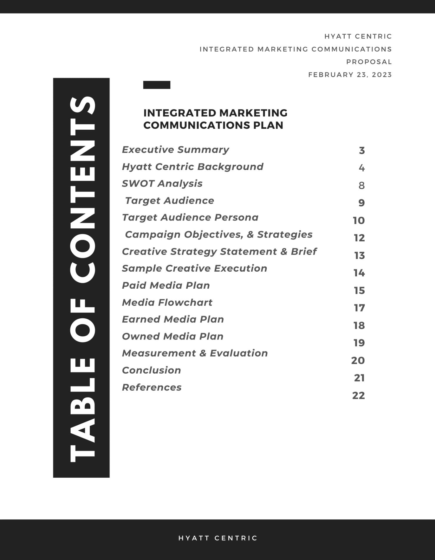 While Hyatt Centric has the goal for guests to ‘Start Here. Discover Everywhere’ this integrated marketing communications plan will start here and discover a whole new world to effectively meet our target audience, boost brand awareness and provide a new twist on guests seeking to visit our hotel for special events. After this campaign is implemented, we will be more than the city-centered hotel where folks can find themselves in the heart of the action…we’ll be the destination people are calling to book months in advance because they want to create their special moments with us.