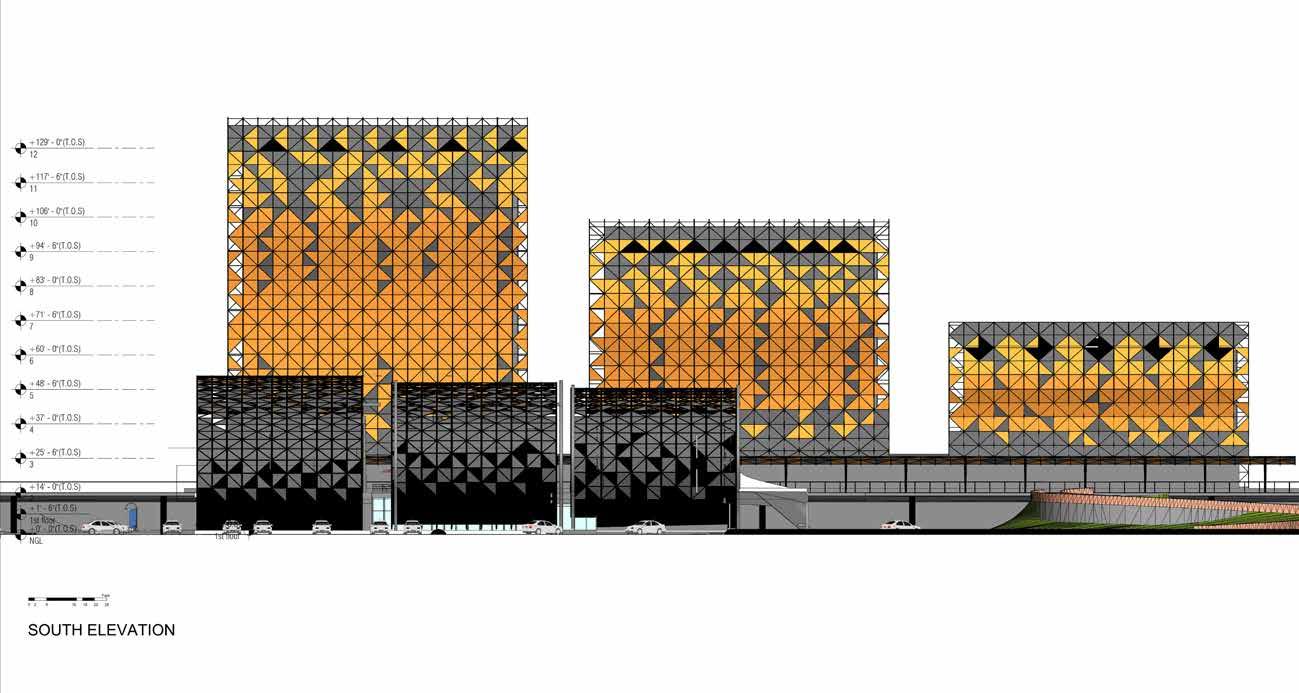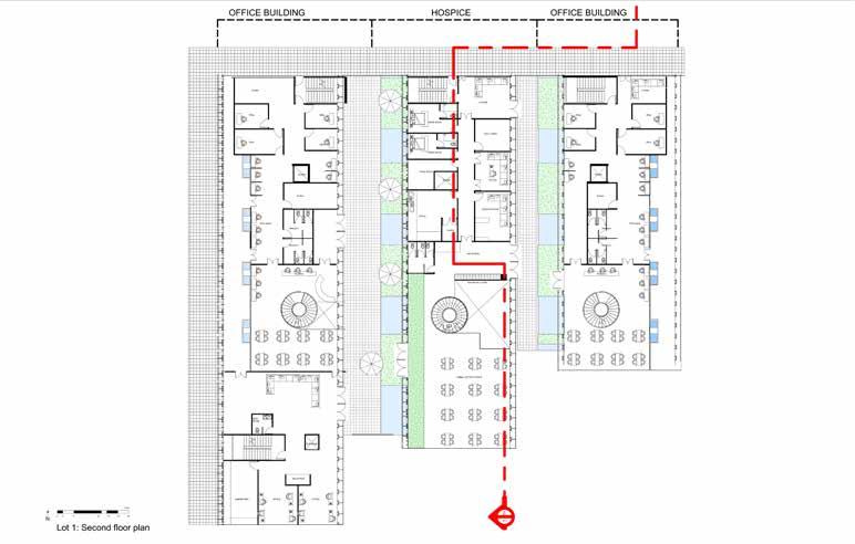 Buildings Stepped in Plan and Elevation to Maximize Views Buildings Sliced to Allow for Daylight Skin Sweeps Over Buildings as Protective Covering Skin Manipulated for Energy Efficiency Office Space Hospice Walk-In Clinic Pediatric Office Residential Retail