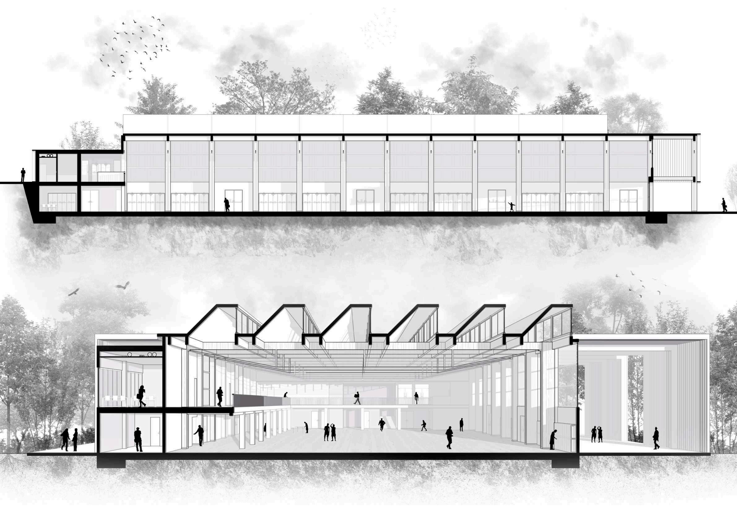 En esta sección se puede observar la propuesta de la nueva cubierta la cual cuenta con una cubierta a dos aguas como en su origen. La cubierta cuenta con aberturas las cuales generan patios interiores al edificio para así tener más iluminación natural y ventilación