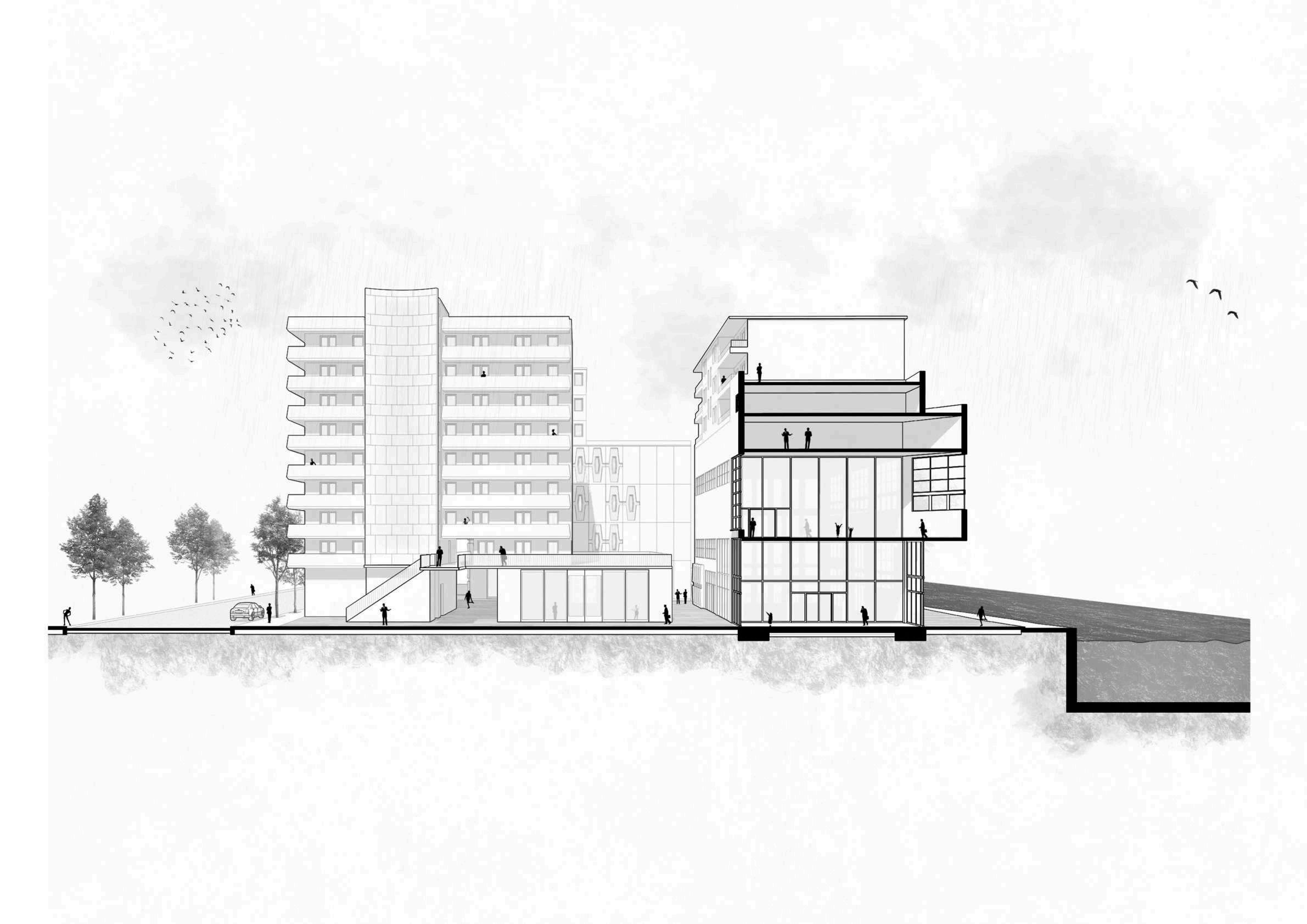 En esta sección transversal de la parcela se explica las diferentes alturas o desniveles que sufre el terreno y como el proyecto se fusiona