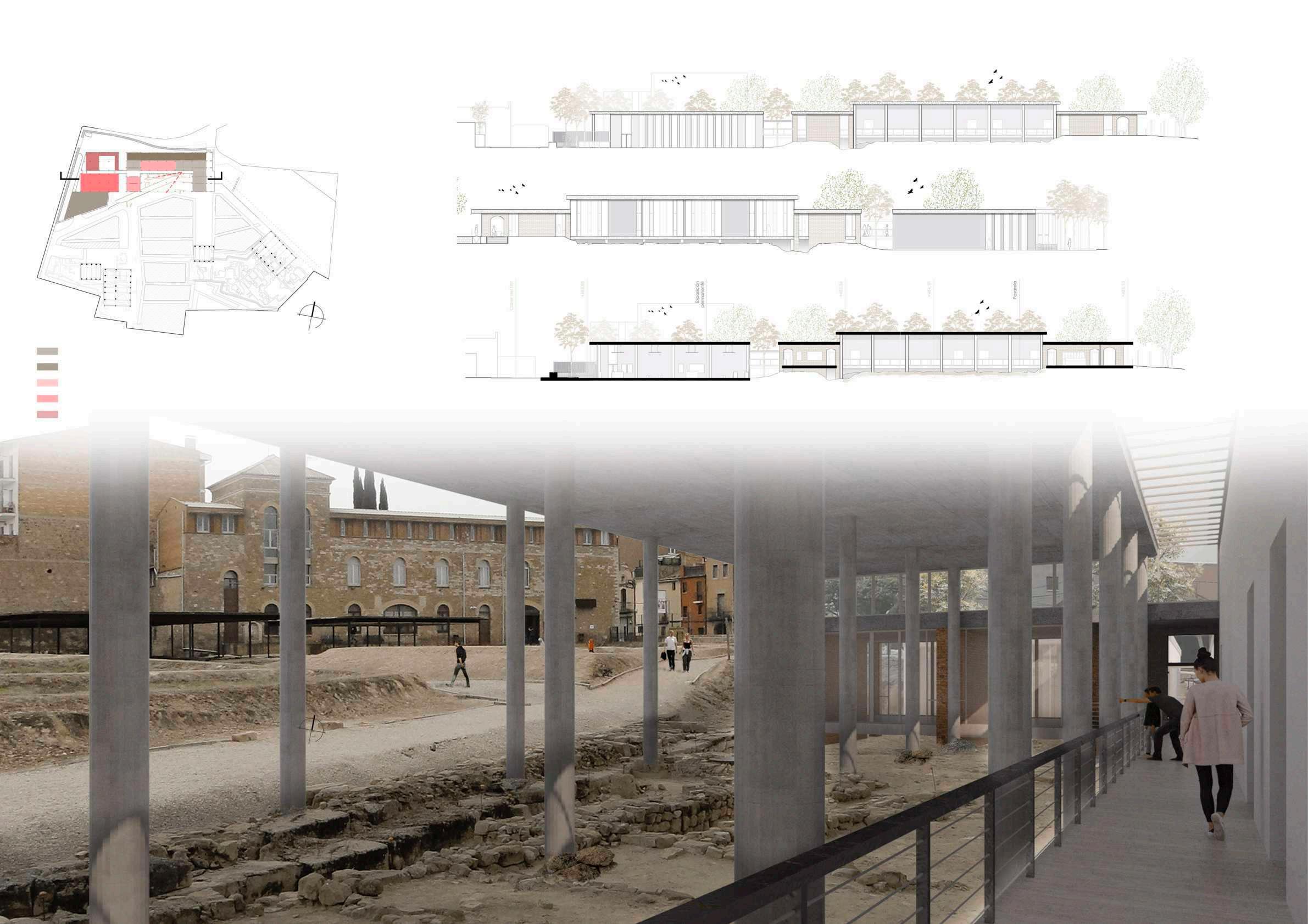 También se puede observar que la pasarela del proyecto al estar en una cota superior a la de las ruinas tiene una vista a todo el emplazamiento lo cual se agradece desde el principio