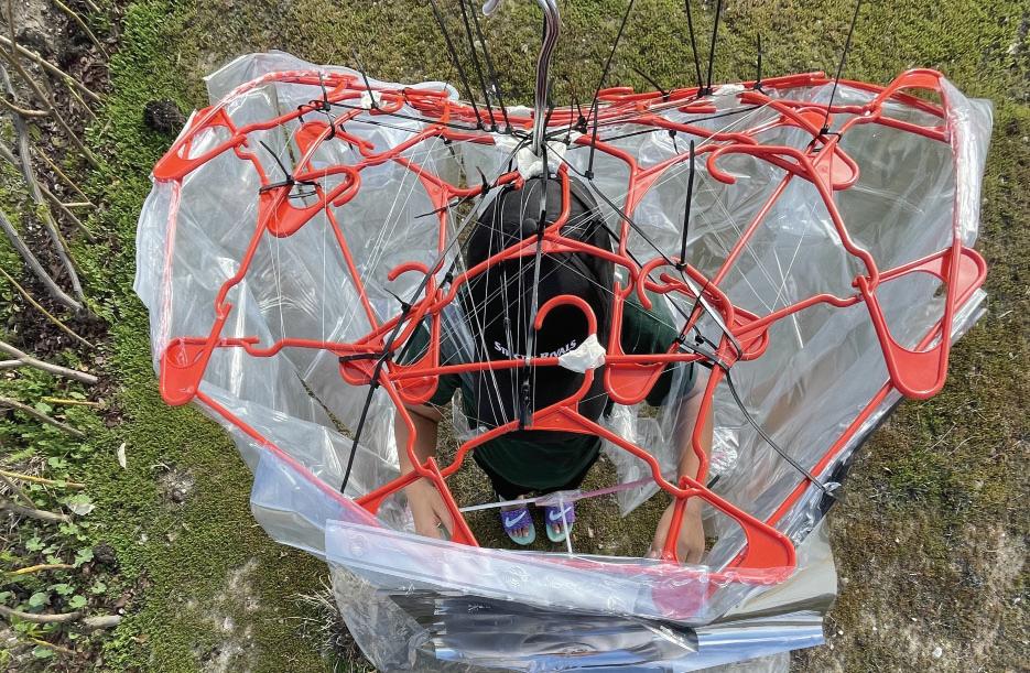 This armor ables its user to step into public, while being able to safe from other people. The user wears a hat and is covered in a layered translucent film, that is supported by a system of hangars, wires. The user has the ability to move freely outside without being cautious about getting sick from others.