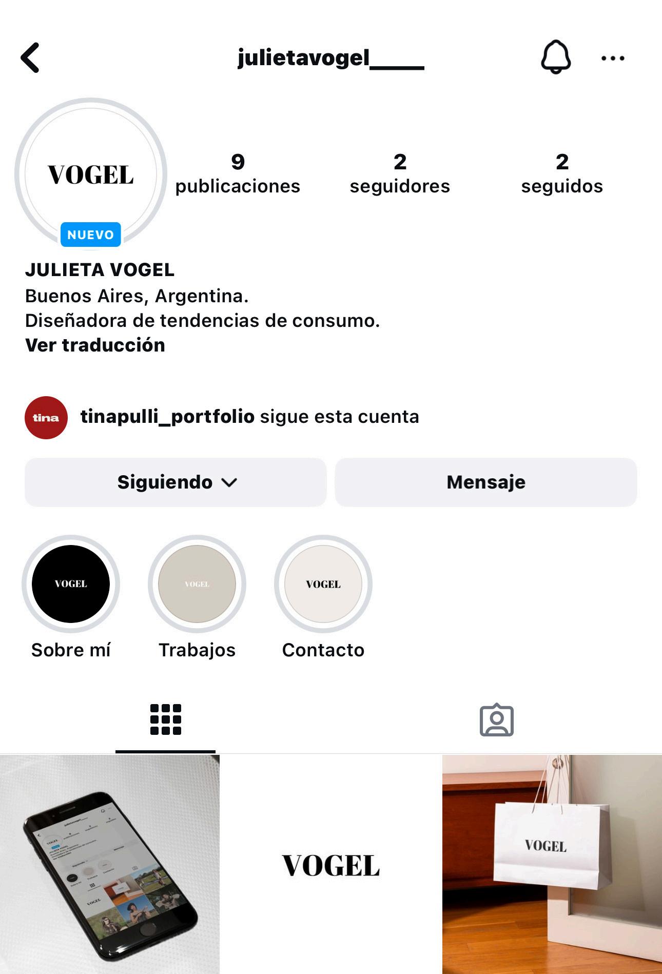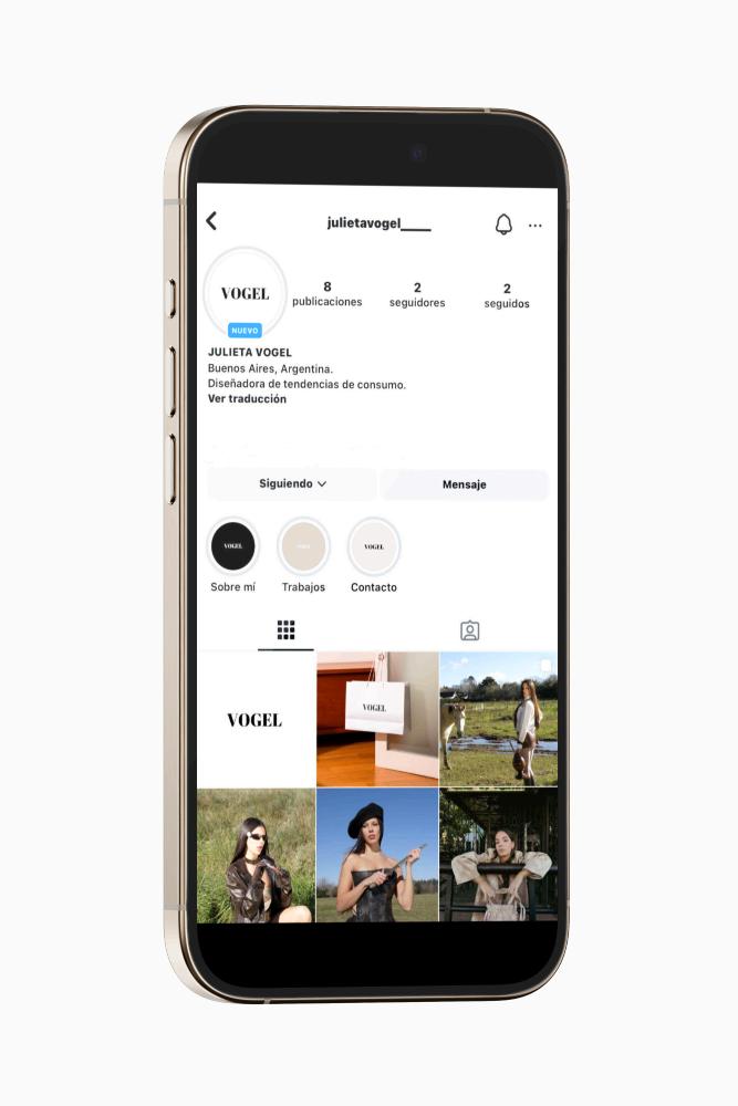 Cuenta de red social Instagram de marca personalizada. Seleccioné como nombre de usuario mi naming, "Julieta Vogel", asegurando así que mi identidad esté presente de manera clara y personal. En cuanto a la foto de perfil, elegí mi logo en blanco y negro, ya que estos colores son más fáciles de leer y reconocer, proporcionando una estética minimalista que refuerza la elegancia y profesionalismo de la marca.