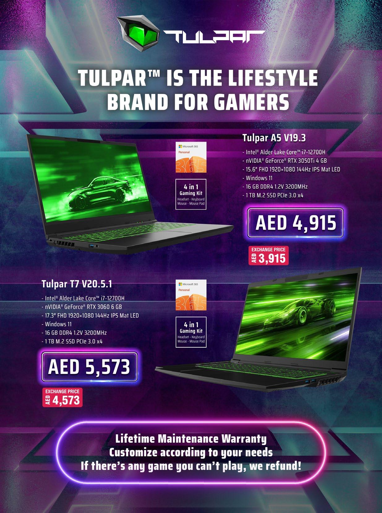 UP BREAK 24th Feb - 26th Mar WITH YOUR OLD LAPTOP Enjoy Exchange Bonus of up to Enjoy Exchange Bonus of up to Enjoy Exchange Bonus of up to Enjoy Exchange Bonus of up to Enjoy Exchange Bonus of up to Enjoy Exchange Bonus of up to Enjoy Exchange Bonus of up to Enjoy Exchange Bonus of up to Enjoy Exchange Bonus of up to Enjoy Exchange Bonus of up to AED 1,0 0 0 AED 1,0 0 0 0 0 AED 1,0 0 0 0 0 AED 1,0 0 0 0 0 AED 1,0 0 0 0 0 1 * For detailed terms and conditions please visit www.jumbo.ae/laptop-exchange WIN WIN WIN 5 Lenovo Tablets & 1 Tulpar Gaming Laptop* 5 Lenovo Tablets & 1 Tulpar Gaming Laptop* Laptop* * For detailed terms and conditions please visit www.jumbo.ae/laptop-exchange 182 24 Months Installment 3,599 AED EXCHANGE PRICE AED 3,899 4,299 RRP AED Pavilion x360 PAVX360-P14-EK0067NE 14” Display 16GB RAM 512GB SSD SAVE 400 AED FREE Gaming Bundle Microsoft 365 229 24 Months Installment Tulpar AR-A5V193 15.6” Display 16GB RAM 1TB SSD 4GB -3050 RRP AED 3,915 AED EXCHANGE PRICE 4,915 SAVE 440 AED