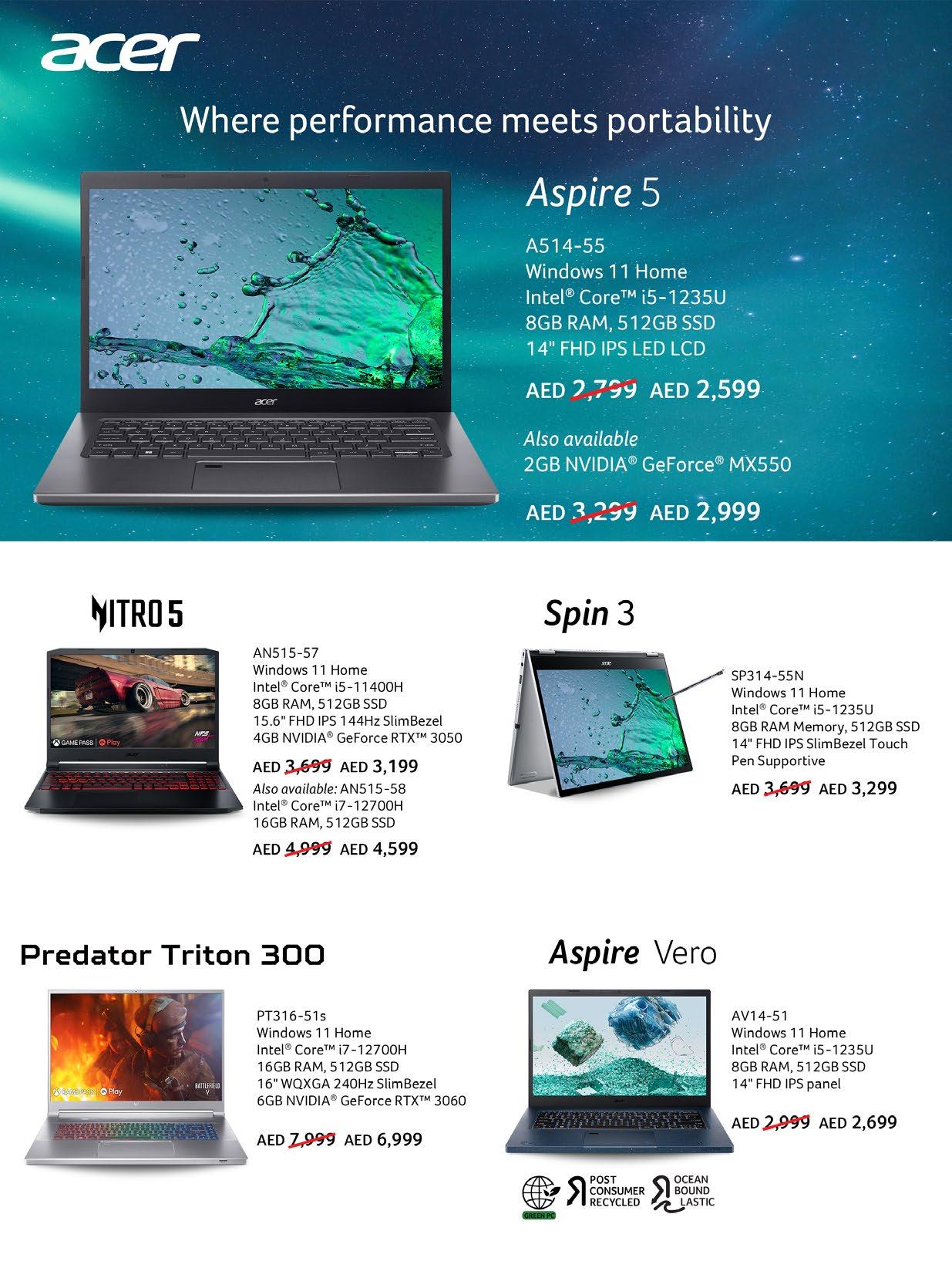LAPTOPS Pay in 18 or 24 month installments Terms and Conditions apply. On a minimum purchase of AED 1000 For more details www.jumbo.ae/easypay Intel® NVIDIA GeForce RTX 3080Ti 16GB GDDR6 Dedicated Graphics, 15 6” FHD 360Hz Display, Windows 11 Home, 1 Year Onsite warranty 16GB RAM 512GB SSD NVIDIA GeForce RTX 3060 6GB Dedicated Graphics, 15 6” FHD 120Hz Display, Windows 11 Home, 1 Year Onsite warranty, 36 Months McAfee Antivirus (pre-loaded) to p 16GB RAM 1TB SSD Intel® Iris® Xe Graphics, Windows 11 Home, 1 Year Onsite warranty, 36 Months McAfee Antivirus (pre-loaded) Intel® Core™ i5-1235U processor, 8GB RAM, 512GB SSD, Intel® UHD Graphics, 14 0” FHD Touch Display, Windows 11 Home, 1 Year Onsite warranty, 36 Months McAfee Antivirus (pre-loaded) Inspi Detects and protects against the latest online threats when you shop, bank, and socialize online 2,69 9 AED EXCHANGE PRICE AED WAS AED 3,299 2,999 Intel® Core™ i7-1255U processor, 8GB RAM 512GB SSD Intel® UHD Graphics, 15 6 FHD Display, Windows 11 Home, 1 Year Onsite warranty, 36 Months McAfee Antivirus (pre-loaded) Inspi ron 15 300 0 La pto p Intel® Core™ i7-11390H processor, 16GB RAM 512GB SSD Intel® Iris® Xe Graphics, 13 3” QHD+ Display, Windows 11 Home, 1 Year Onsite warranty, 36 Months McAfee Antivirus (pre-loaded) Inspi ron 13 500 0 La pto p 2,69 9 AED EXCHANGE PRICE AED WAS AED 3,199 2,999 3,649 AED EXCHANGE PRICE AED WAS AED 4,299 3,949 4,79 9 AED EXCHANGE PRICE AED WAS AED 5,799 5,299 6,39 9 AED EXCHANGE PRICE AED WAS AED 7,299 6,899 14,49 9 AED EXCHANGE PRICE AED WAS AED 15,999 15,499