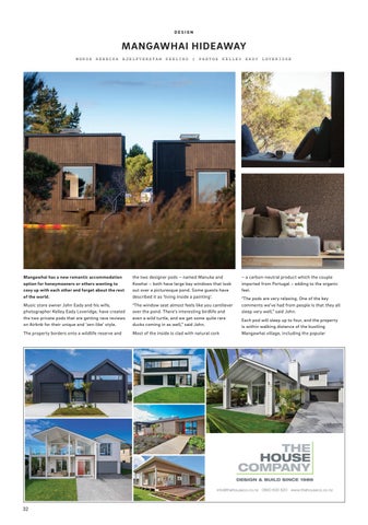 – a carbon-neutral product which the couple imported from Portugal – adding to the organic feel. “The pods are very relaxing. One of the key comments we’ve had from people is that they all sleep very well,” said John. Each pod will sleep up to four, and the property is within walking distance of the bustling Mangawhai village, including the popular