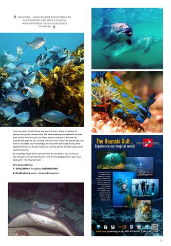 If you’ve never dived before and want to learn, there are plenty of options for you to choose from. We have evening and weekend courses, with online theory so you can learn at your own pace. And we can provide the gear for you to keep the costs low. If you’re experienced, but want to increase your knowledge and do some advanced diving, New Zealand Diving is a 5-star instructor training centre for both sports and technical diving. So we pretty much have it all covered; all we need is you. Give us a call and join us on an adventure in the marine playground in your own backyard – the Hauraki Gulf. New Zealand Diving T: 094223599 or free phone 0800NZDIVING E: dive@nzdiving.co.nz | www.nzdiving.co.nz C