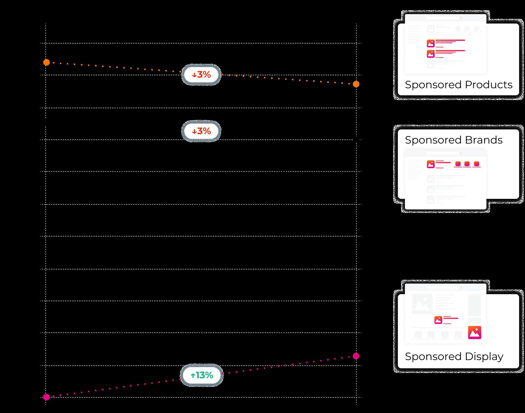 Spend for Sponsored Brands dropped from 17% to 15%, while Sponsored Display ad spend remained consistent from 2022 to 2023.