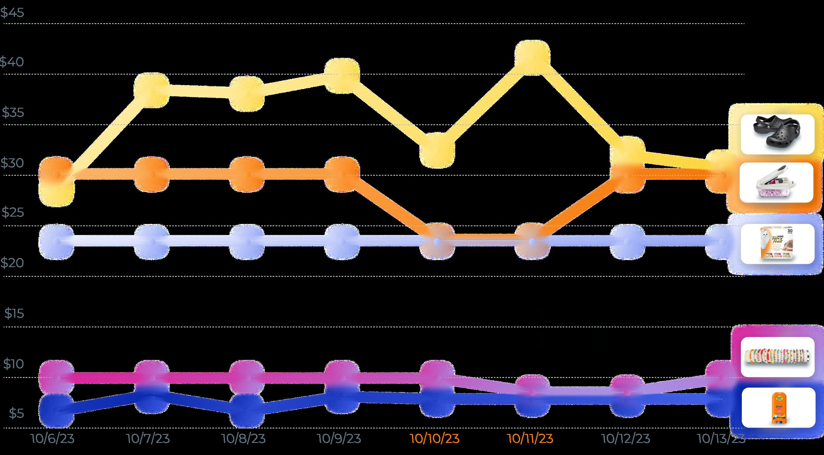 Several of these products experienced price drops on at least one of the two days in Amazon’s Big Deal Days event in 2023. The price of the Crocs was lowest on Oct. 10, the Redtwo bracelet-making kit on Oct. 11, and Mueller’s vegetable slicer was more than $5 lower than its typical price on both days. The Purina Fancy Feast Wet Cat Food was the most consistently priced throughout the week, showing no impact from the event.