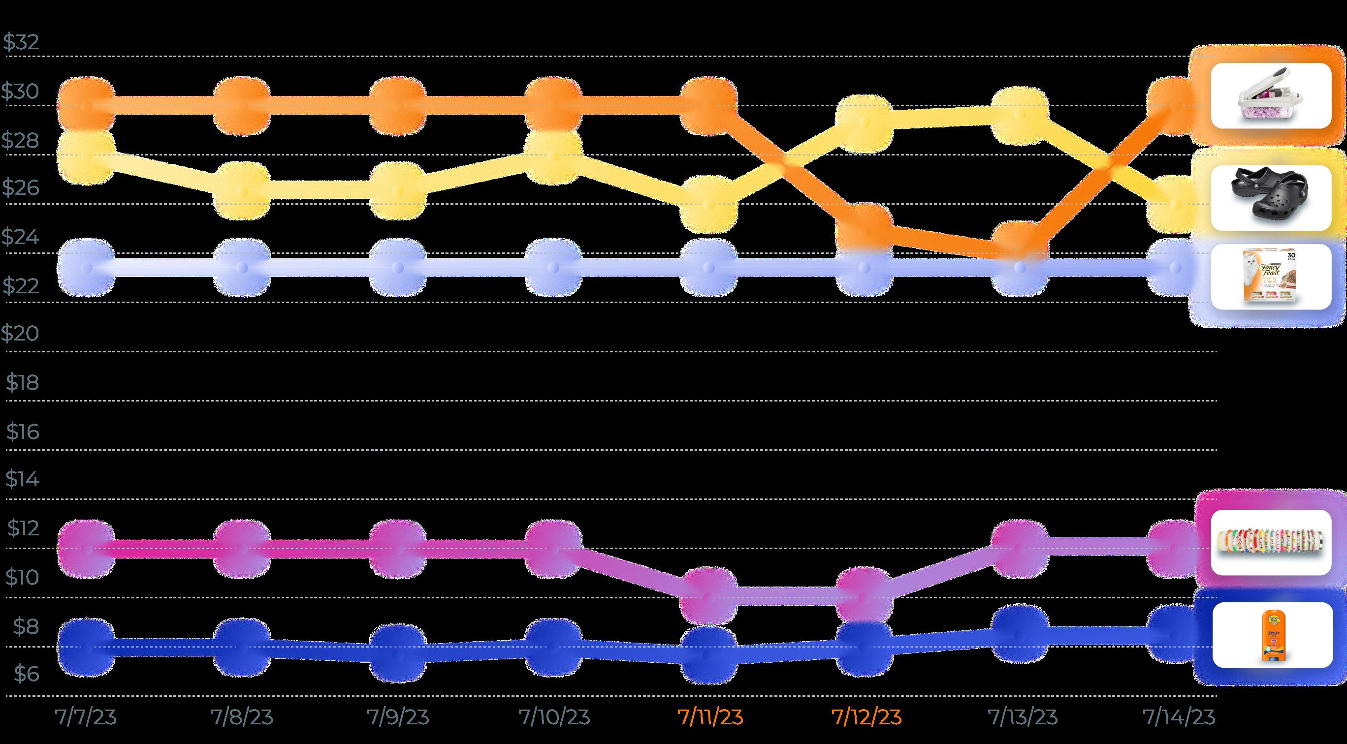 Pricing data from the seven-day period surrounding Prime Day in 2023 shows that among these five best-selling products, all but Purina’s cat food offered some sort of deal on at least one day of the two-day event.