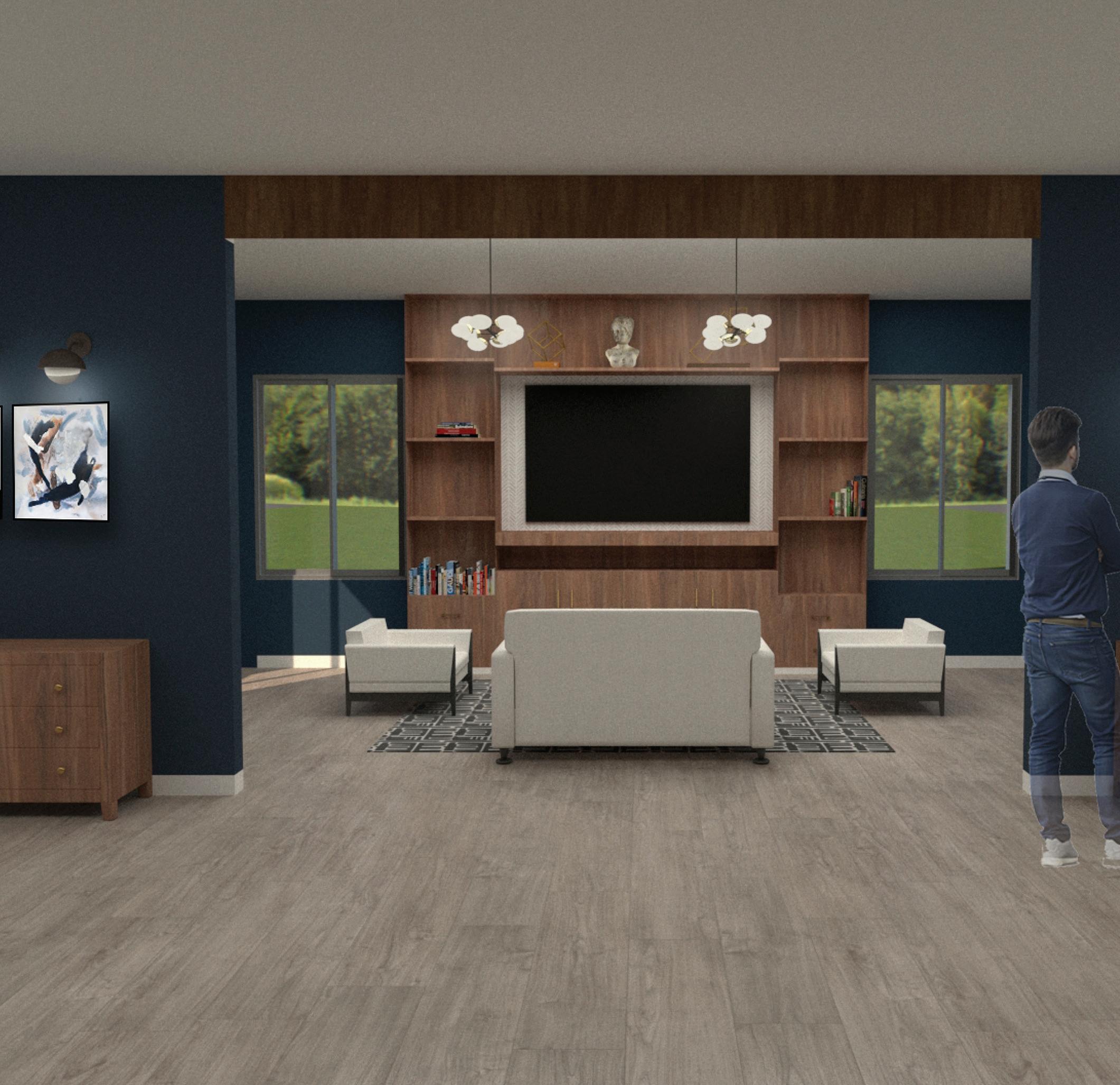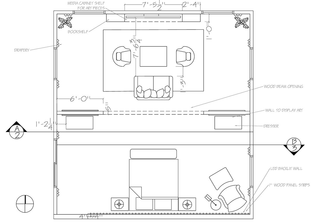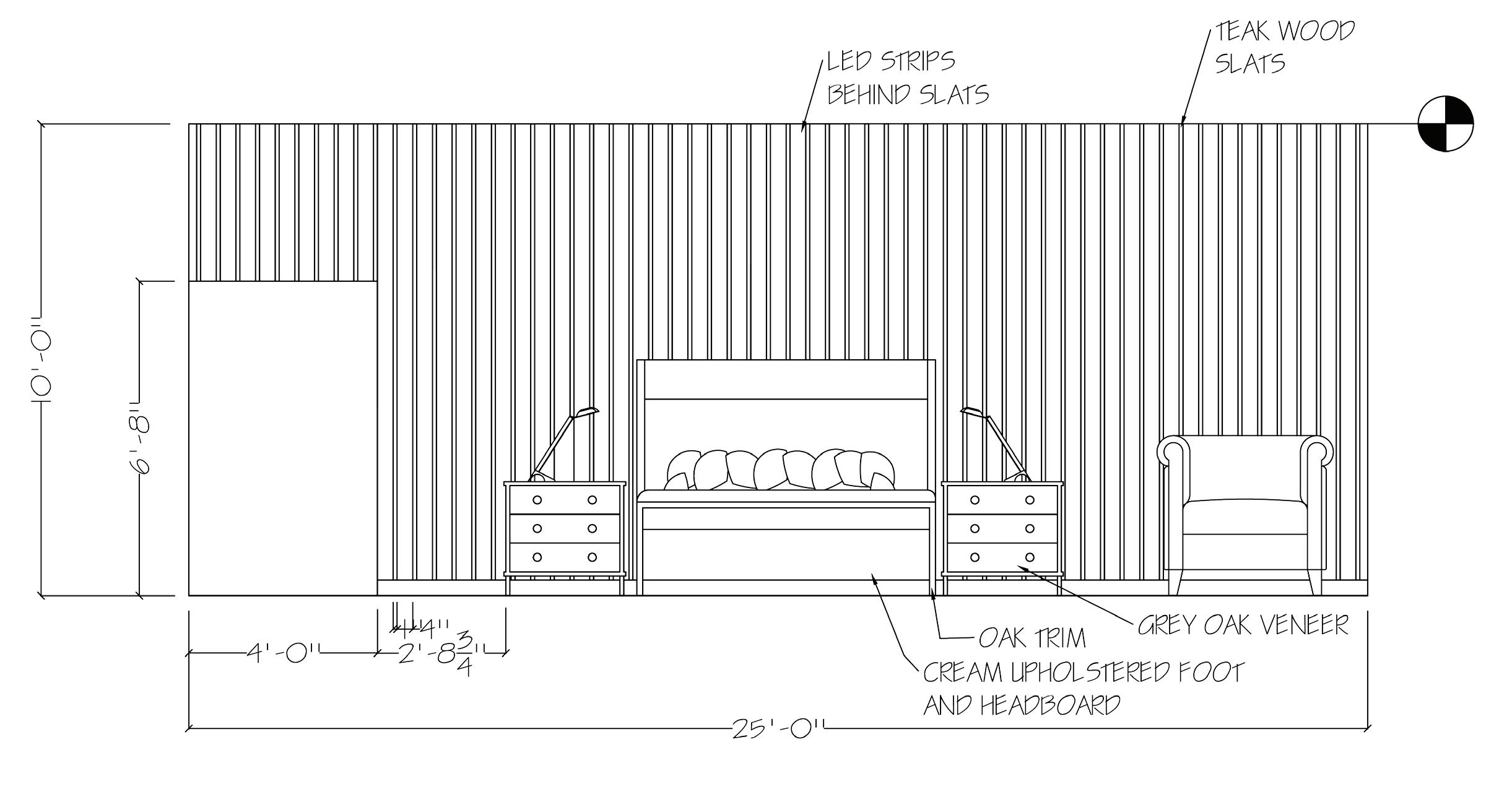 Produced in Autodesk AutoCAD and Sketchup with V-Ray. Enhanced with Adobe Photoshop Entertainment Wall Elevation Sketch Floor Plan 1/2”=1’-0” Armstrong Slat Wall- Warm Oak Circa Lighting- Prescott Chandelier Arteriors Jobe Dresser- Smoke Kravet Boarding Pass Noir- Velvet Bedding 5. Sherwin Williams- Moscow Midnight Paint 6. Kravet Devereaux Sconce- Black and Brass