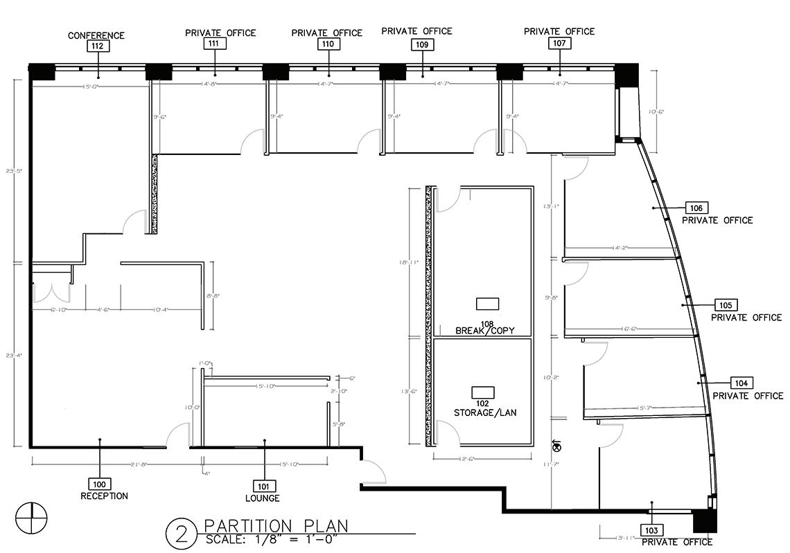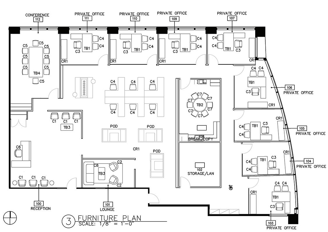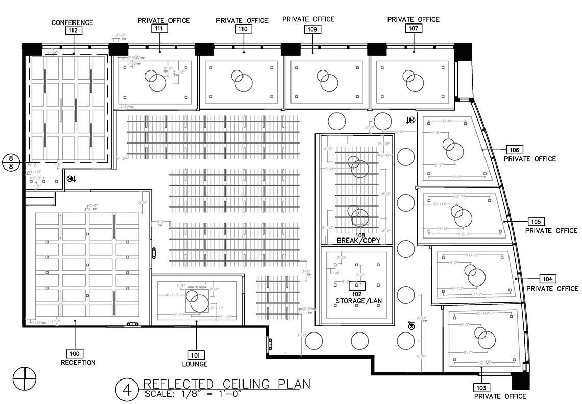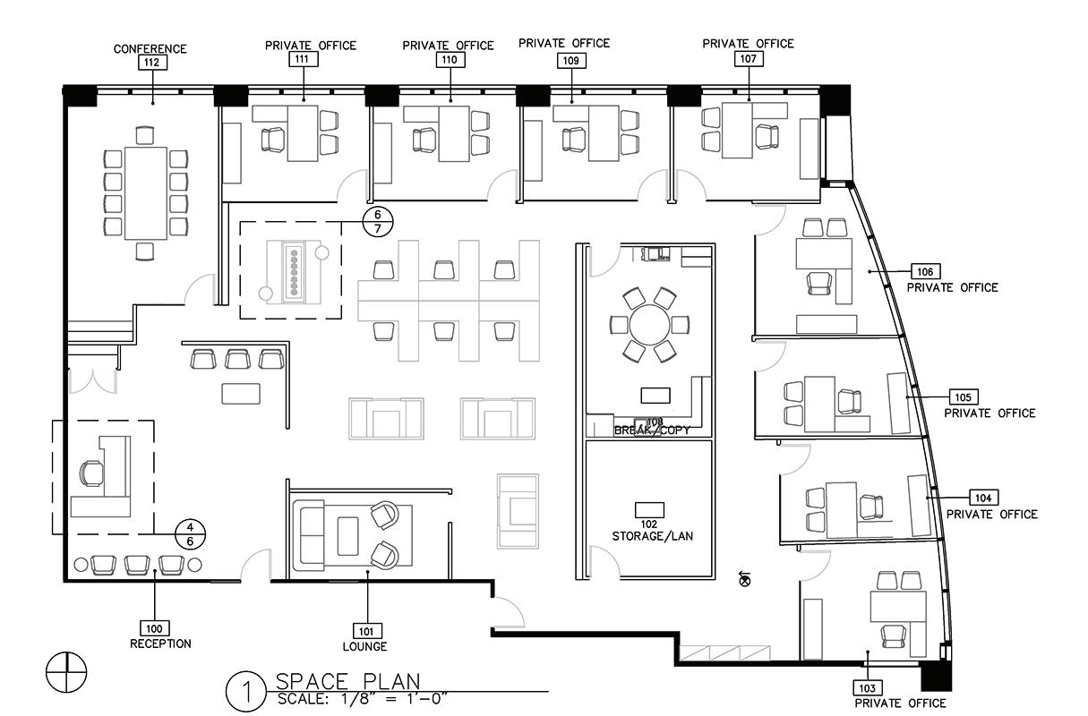 The objective was to design an office space for an advertising company. With several requirements from the client such as a reception space, a large conference room, a small conference room, 8 private offices, 6 workstations, and a break/copy room.