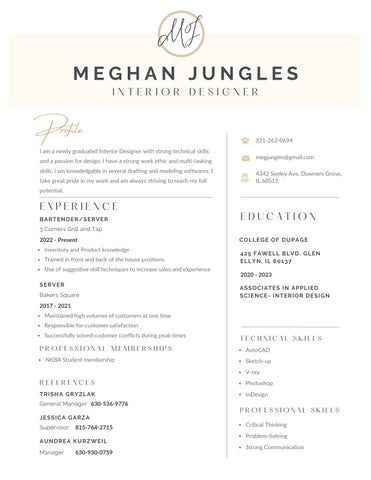 Meghan Jungles is a recent Interior Design program graduate from the College of DuPage. She is passionate about design and has a great set of technical skills. She enjoys the drafting and modeling process of design and takes pride in all her work. She enjoys working with Autodesk AutoCAD and Sketchup, as well as Adobe Photoshop and InDesign. She is eager to get into the field and believes her years in the service industry will greatly benefit her, providing excellent customer service to clients in a creative work environment.