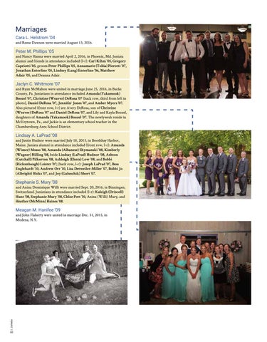 and Nancy Hanna were married April 2, 2016, in Phoenix, Md. Juniata alumni and friends in attendance included (l-r): Carl Kihm ’05, Gregory Capriotti ’05, groom Peter Phillips ’05, Annamarie (Tobia) Pierotti ’07, Jonathan Enterline ’05, Lindsey (Lang) Enterline ’06, Matthew Adair ’05, and Deanna Adair.