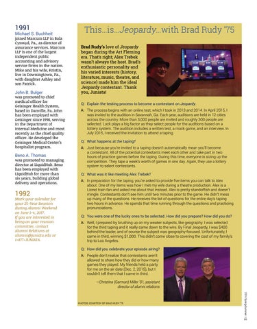 Brad Rudy’s love of Jeopardy began during the Art Fleming era. That’s right; Alex Trebek wasn’t always the host. Brad’s enthusiastic personality and his varied interests (history, literature, music, theatre, and science) made him the ideal Jeopardy contestant. Thank you, Juniata! Q: Explain the testing process to become a contestant on Jeopardy. A: The process begins with an online test, which I took in 2013 and 2014. In April 2015, I was invited to the audition in Savannah, Ga. Each year, auditions are held in 12 cities across the country. More than 3,000 people are invited and roughly 300 people are selected. Luck plays a big factor as they select people for the auditions based on a lottery system. The audition includes a written test, a mock game, and an interview. In July 2015, I received the invitation to attend a taping. Q: What happens at the taping? A: Just because you’re invited to a taping doesn’t automatically mean you’ll become a contestant. All of the potential contestants meet each other and take part in two hours of practice games before the taping. During this time, everyone is sizing up the competition. They tape a week’s worth of games in one day. Again, they use a lottery system to select contestants. Q: What was it like meeting Alex Trebek? A: In preparation for the taping, you’re asked to provide five items you can talk to Alex about. One of my items was how I met my wife during a theatre production. Alex is a Lionel train fan and asked me about that instead. Alex is pretty standoffish and doesn’t mingle. Contestants don’t see him until two minutes prior to the game. He didn’t mess up many of the questions. He receives the list of questions for the entire day’s taping two hours in advance. He spends that time running through the questions and practicing pronunciations. Q: You were one of the lucky ones to be selected. How did you prepare? How did you do? A: Well, I prepared by brushing up on my weaker subjects, like geography. I was selected for the third taping and it really came down to the wire. By Final Jeopardy, I was $400 behind the leader, and of course the subject was geography-focused. Unfortunately, I came in third, winning $1,000. This didn’t come close to covering the cost of my family’s trip to Los Angeles. Q: How did you celebrate your episode airing? A: People don’t realize that contestants aren’t allowed to share how they did or how many games they played. My friends held a party for me on the air date (Dec. 2, 2015), but I couldn’t tell them that I came in third.