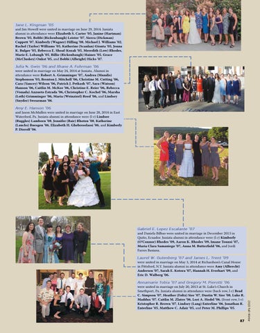 and Daniela Bilbao were united in marriage in December 2013 in Quito, Ecuador. Juniata alumni in attendance were (l-r) Kimberly (O’Connor) Rhodes ’09, Aaron K. Rhodes ’09, Imane Tounsi ’07, Maria Clara Samaniego ’07, Anna M. Butterfield ’06, and Jordi Farres Basiana. Laurel W. Gutenberg ’07 and James L. Trent ’09