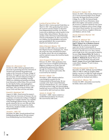 January 18, 2010—After Juniata, Richard went on to receive his dental degree from Temple University. He began his practice in State College, Pa., in 1986. He enjoyed family vacations in the Pocono Mountains, times filled with laughter and summer activities. He served as a volunteer dentist for the Centre Volunteers in Medicine and as a State College Area School Board member. He is survived by wife of 26 years Patricia, daughters Mckenzie and Madison, and son Andy. Susan (Garner) Warner ’80