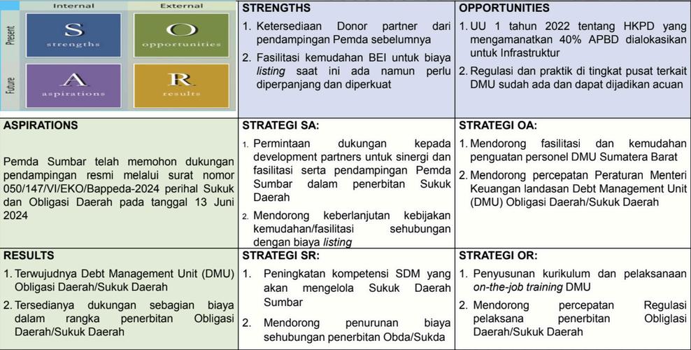 Berbagai strategi akan ditempuh untuk penguatan ekosistem dan dukungan para pihak dalam rangka mewujudkan Debt Management Unit (DMU) pengelola Obda/Sukda, dan penyediaan dukungan sebagian biaya dalam rangka penerbitan Obda/Sukda. Proyek perubahan akan menjadikan pemerintah daerah Sumatera Barat sebagai percontohan penerbitan Obda/Sukda pertama di Indonesia.