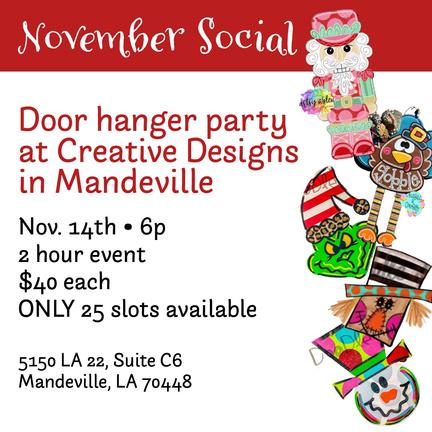 Join us in November to create holiday door hangers at Creative Designs on 11/14. Only 25 slots available! Watch for a link coming soon!