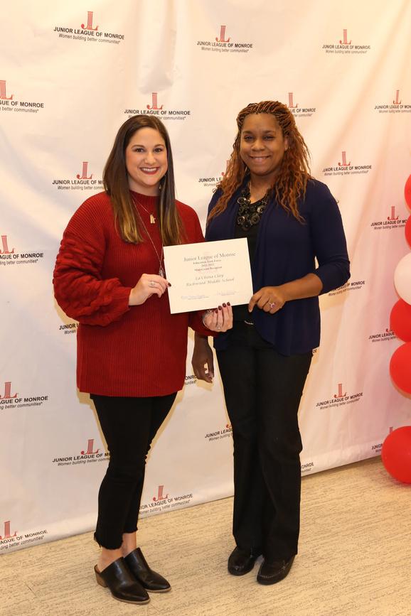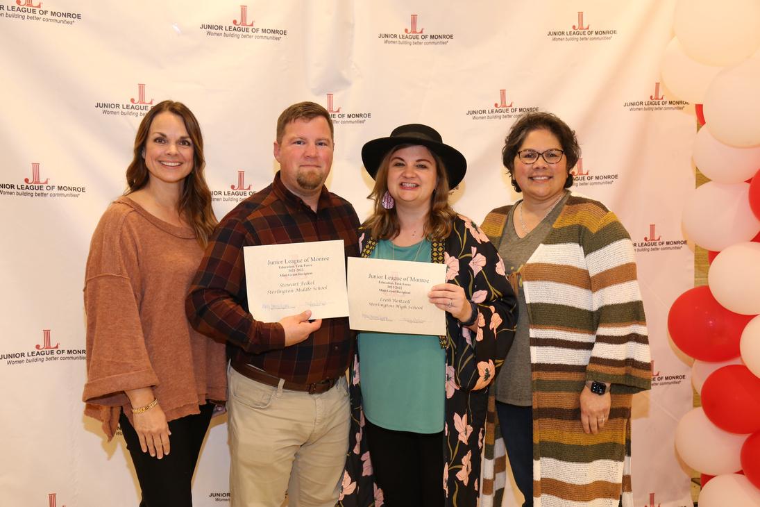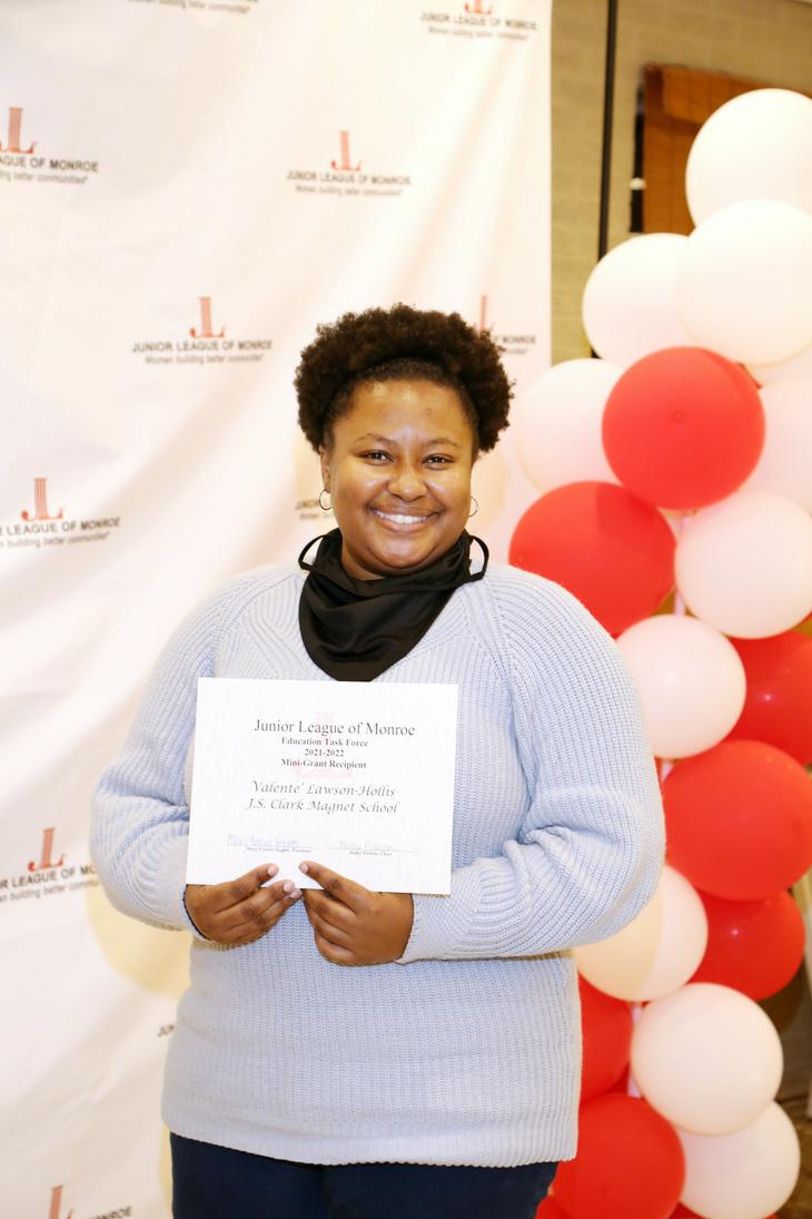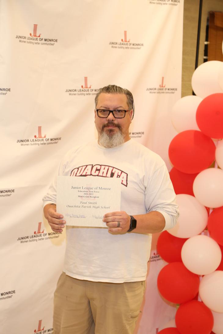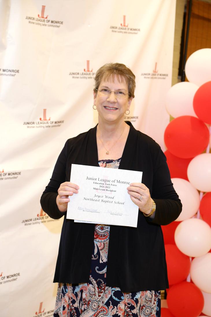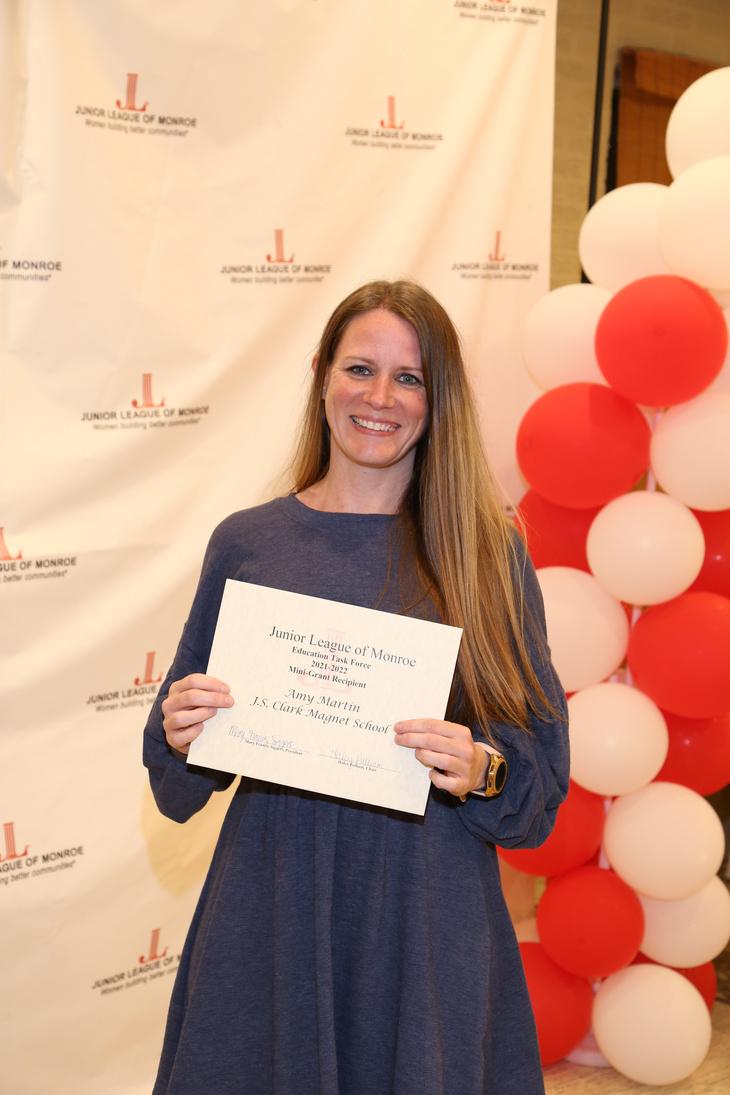 Teacher Mini Grants The Junior League of Monroe Teacher Mini Grant reception was held on November 18, 2021 at the Junior League House. This year we had the honor of awarding 41 teachers with grants. All our recipients submitted applications for outstanding programs that will help students in our community continue to grow and learn in a fun environment. It was so rewarding to see the passion these teachers have for their students. Teachers are always looking for new ways to help each student learn, and I was honored to be able to help these teachers in their quest to grow new programs within their schools. Below is the list of teachers that were awarded mini grants this year. Amie Johnson Amy Cheveallier Amy Many Amy Martin Angela Leach Brandon McQuillin Charlene Maxwell Debbie Graves Elizabeth Griffon & Dan Lindow Emily Smith Erin Perry Ginger Stapp Hannah Nance Heather Brewer Joyce Wood Justin Overacker Kandice Lockwood Kyla Eberts La’China Clay Laura Chrislip Lauren Voorhees Leah Reitzell Lisa Cole Lissy Compton Marian Clinton Matthew Knopps Melanie Luke Meredith Branch Miranda Hall Paul Smith Ronnia Williamson Roxanne Santos Ryan Powell Sherry Carver Stacey Guerriero Stewart Felkel Susan Sivils Suzy Spencer Tracie Crowson Tracy Rayborn Valente' Lawson Hollis Northeast Baptist School Swayze Elementary West Ridge Middle School J S Clark Magnet West Ridge Middle School Ouachita Christian School Boley Elementary Highland Elementary St. Frederick's High School Boley Elementary Claiborne Christian Good Hope Middle School J S Clark Magnet Boley Elementary Northeast Baptist School Wossman High School Ouachita Parish High School Grace Episcopal Richwood Middle School West Ridge Middle School Sallie Humble Sterlington High School J S Clark Magnet Richwood High School West Ridge Middle School Wossman High School Central Elementary Boley Elementary Thomas Jefferson Upper Elem. Ouachita Parish High School J.S. Clark Magnet MLK Junior High Sterlington Middle School Woodlawn Elementary Boley Elementary Sterlington Middle School Lexington Elementary Central Elementary Grace Episcopal Lenwil Elementary J.S. Clark Magnet