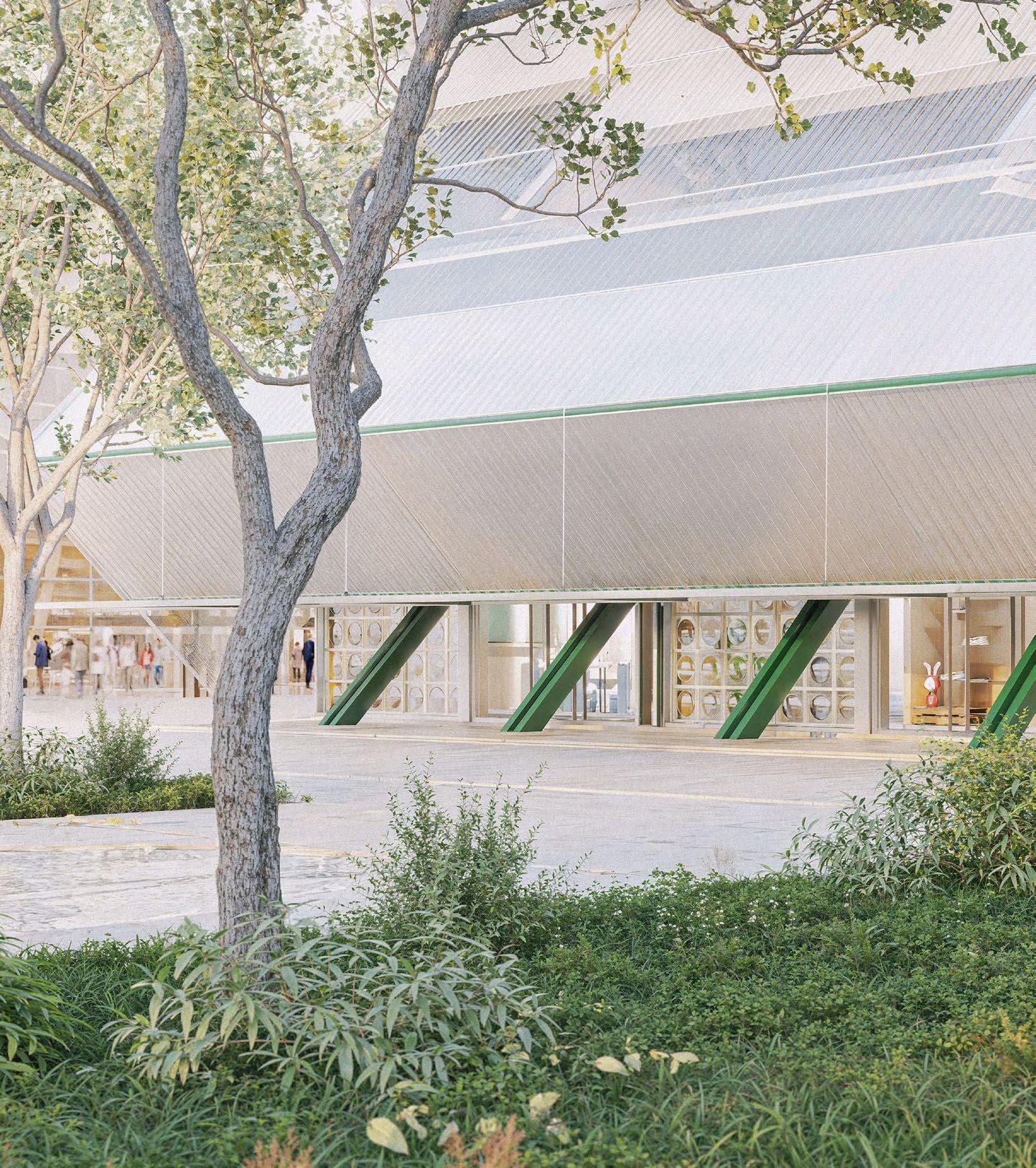This artificial landscape transforms fluidly between recreation, parking, and commercial uses, embodying District’s integration of living and working spaces.