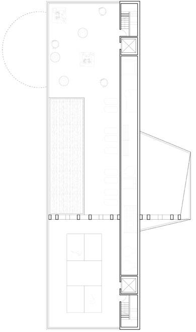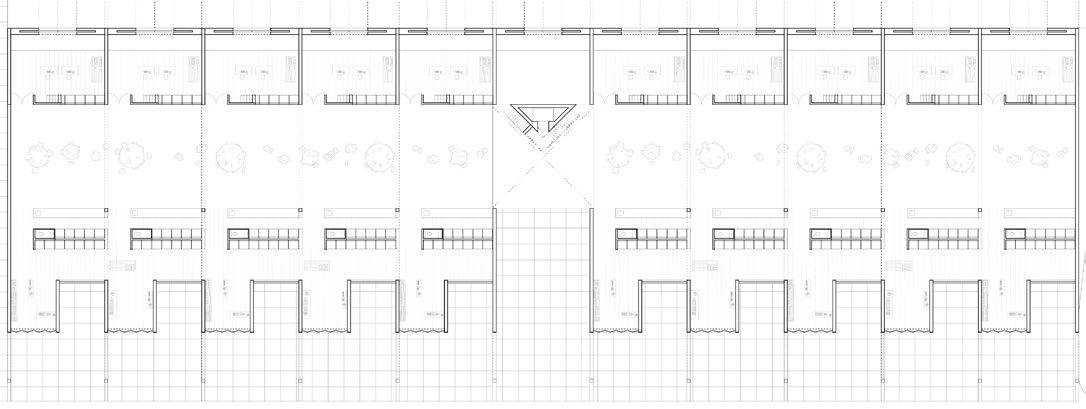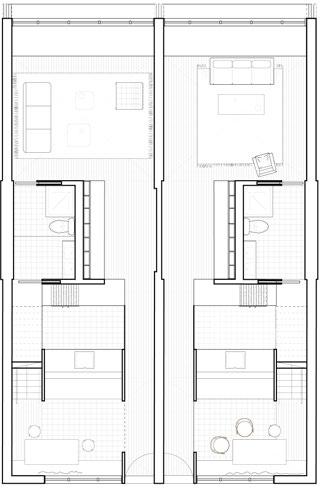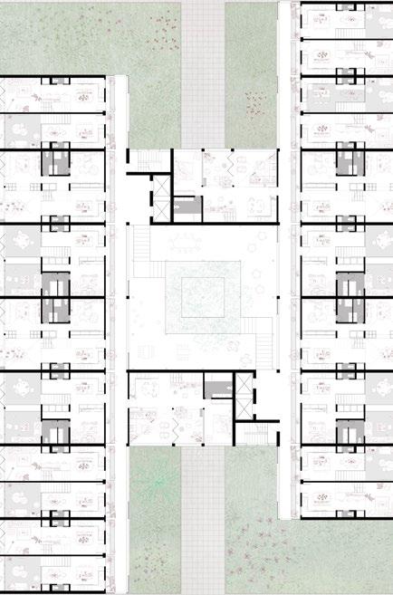 This project reimagines an existing office complex in Chelsea, MA as a shared living environment, transforming it into a social forum between low-rise industrial and dense residential zones. The design balances collective experience with individual autonomy, creating a new model of public housing that bridges the site’s contrasting urban contexts. Ground Plan: The outdoor
