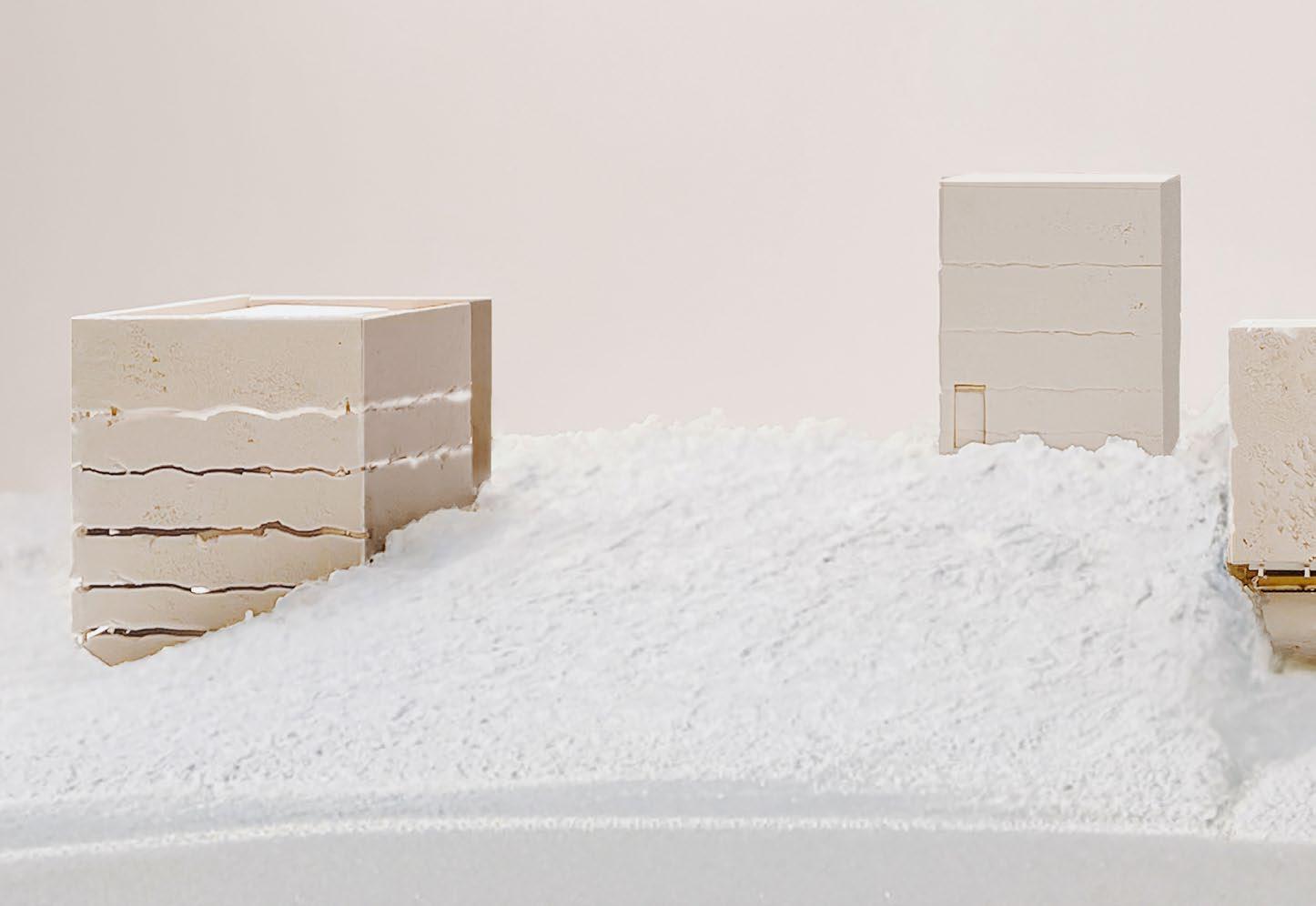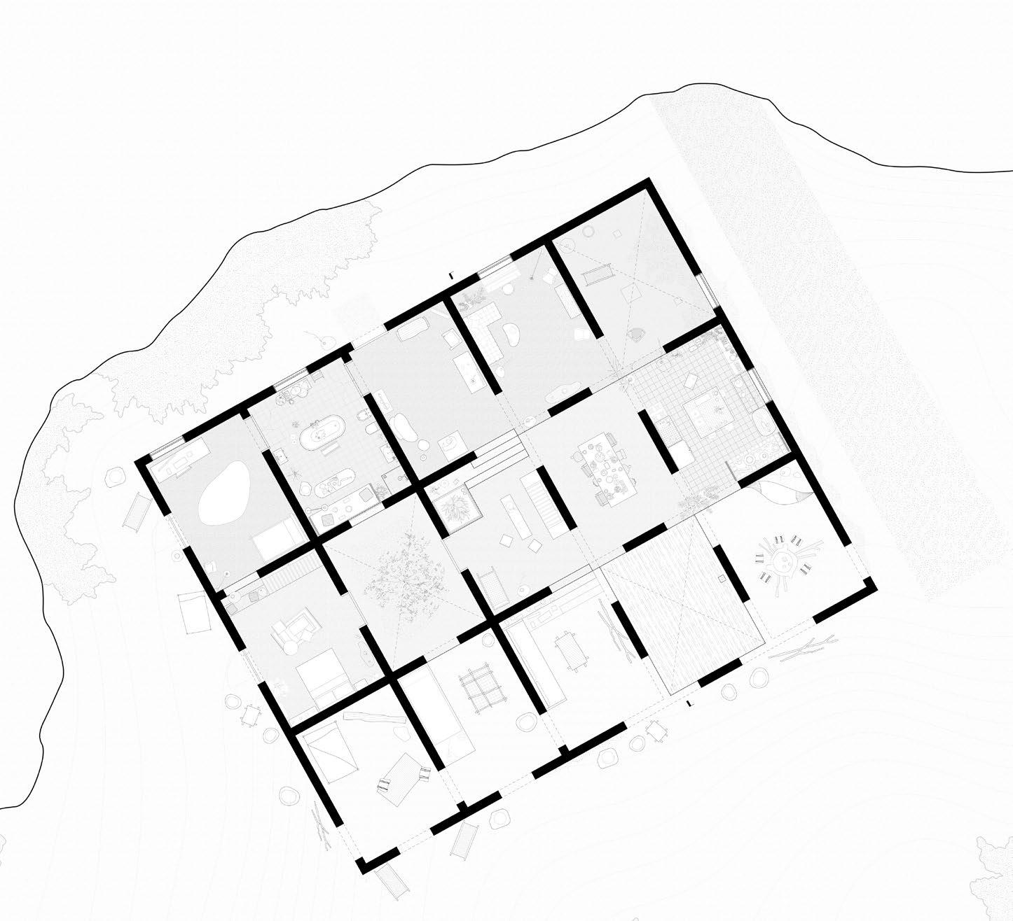 Within each room, walls act as living membranes between inside and out, creating identical vessels that come alive through the stories they contain. Like siblings sharing the same DNA but expressing different souls, these uniform spaces reveal their unique character through the objects and moments they shelter. Rather than imposing itself upon the land, the building follows the earth’s own rhythm, transforming into terraced slopes that echo the ancient gesture of mountains.