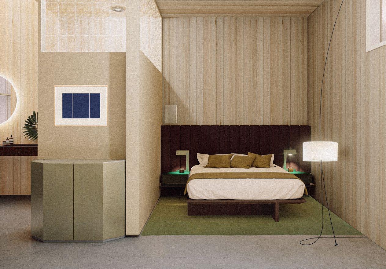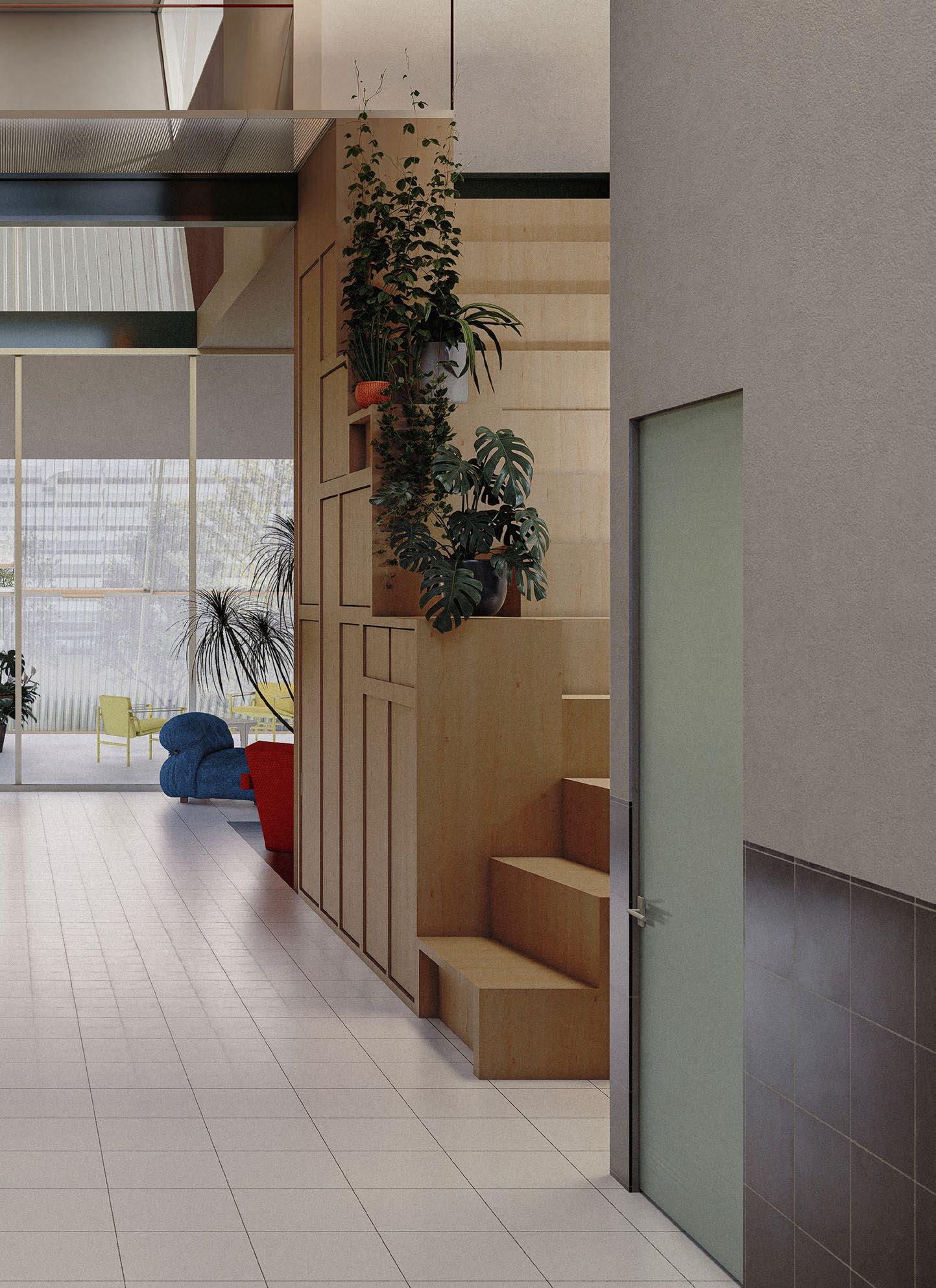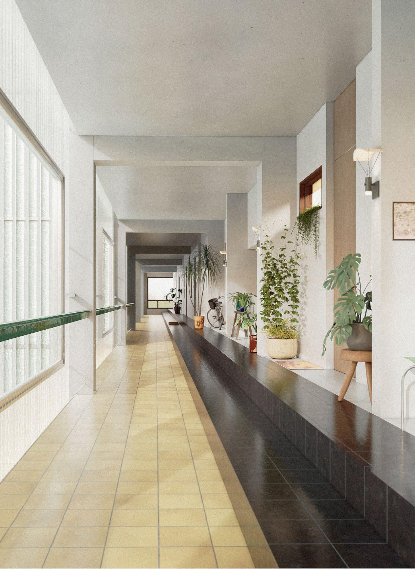 This organization responds to the building’s civic nature by creating micro-communities within each floor – shared cooking and dining spaces flow into individual living areas, while quiet zones for work or rest are tucked away from the more active social spaces. The material palette shifts from robust, communal surfaces near shared zones to warmer, more tactile finishes in private areas, reinforcing the spatial hierarchy while maintaining visual continuity throughout.