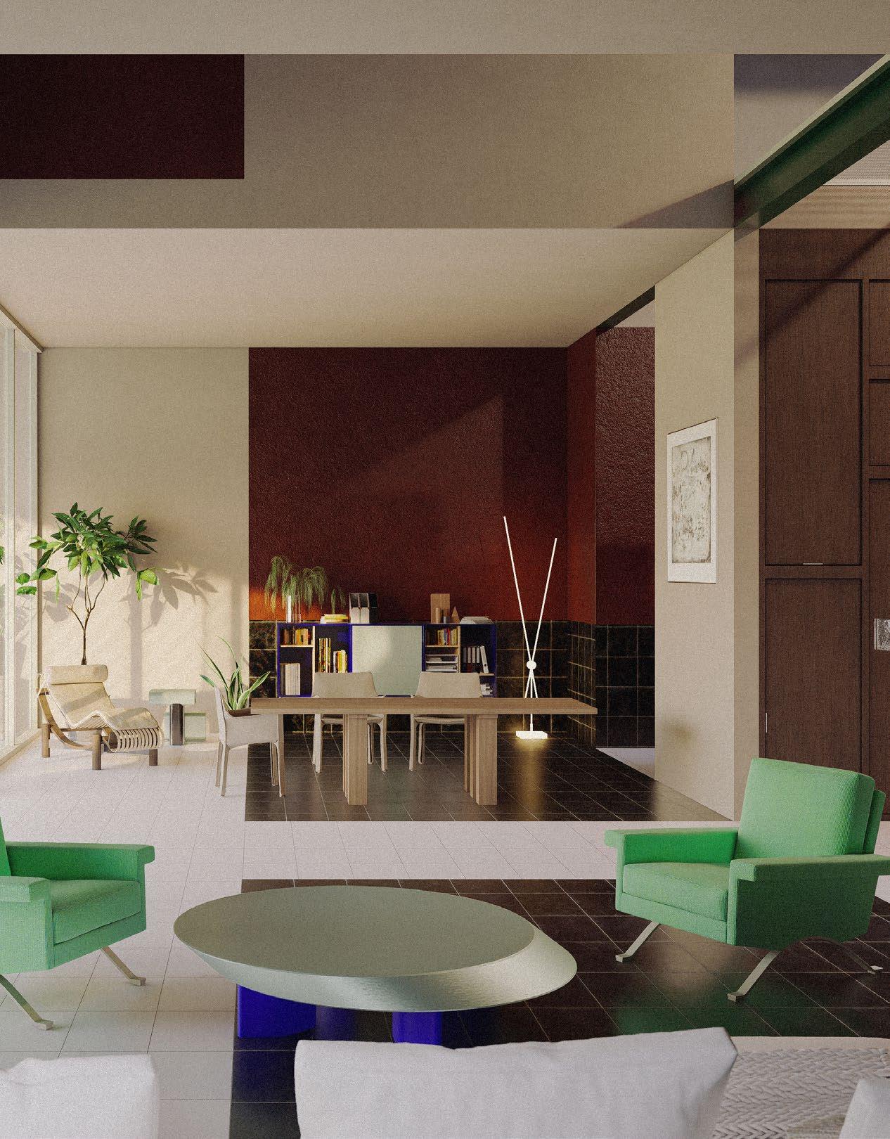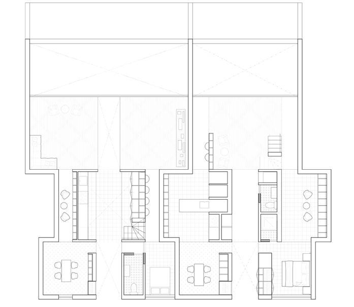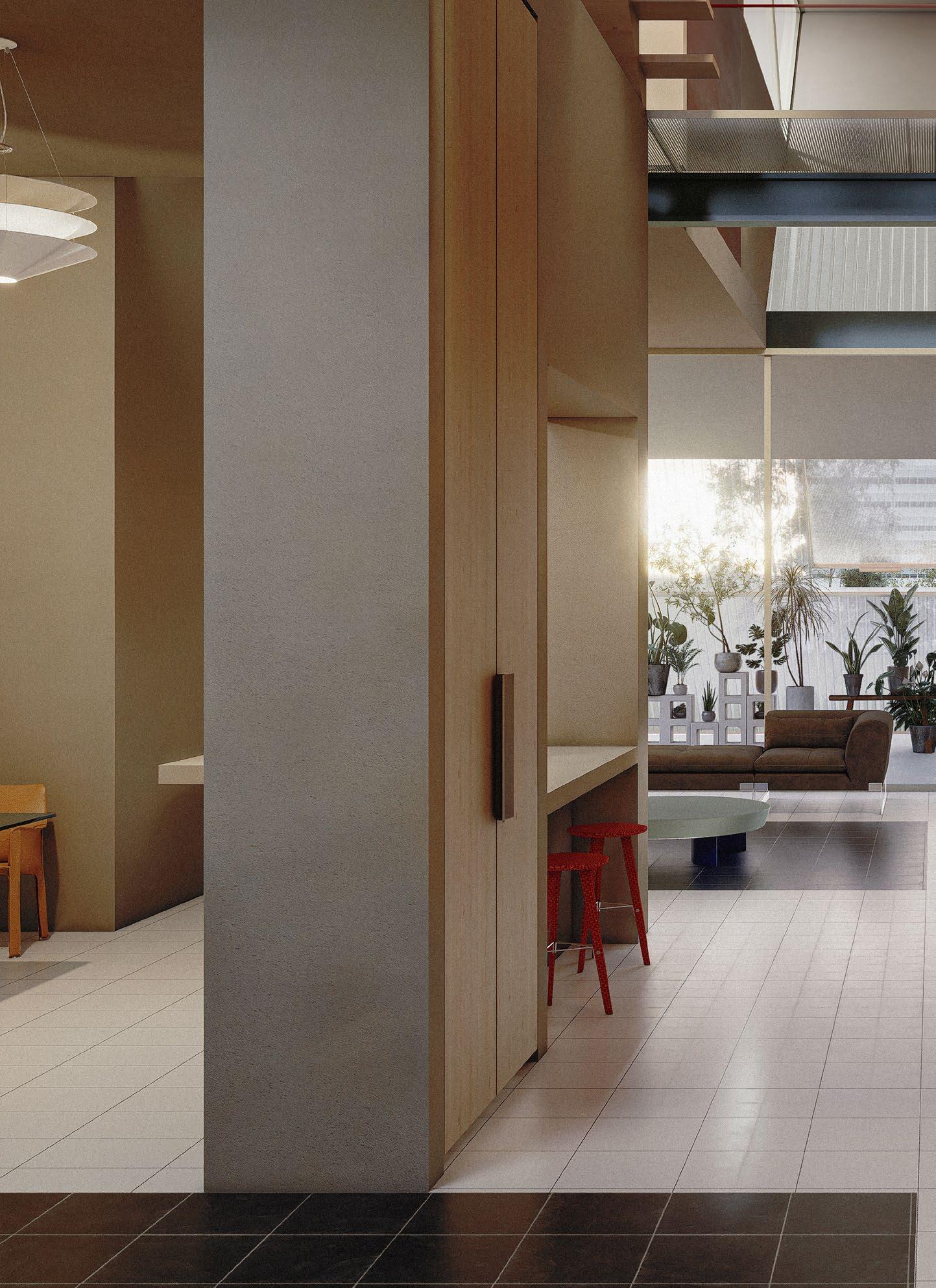 The design transforms the existing structure hybrid living-working environment that responds context. The project introduces a ‘make + create concept where shared workshop spaces and ual work zones coexist with living quarters positioned above. A central service core containing kitchen bathrooms divides the living spaces without traditional doors, creating flexible rooms that adapt to residents’ needs. This innovative layout allows inhabitants directly above their workspaces while maintaining building’s role as a bridge between contrasting scales.