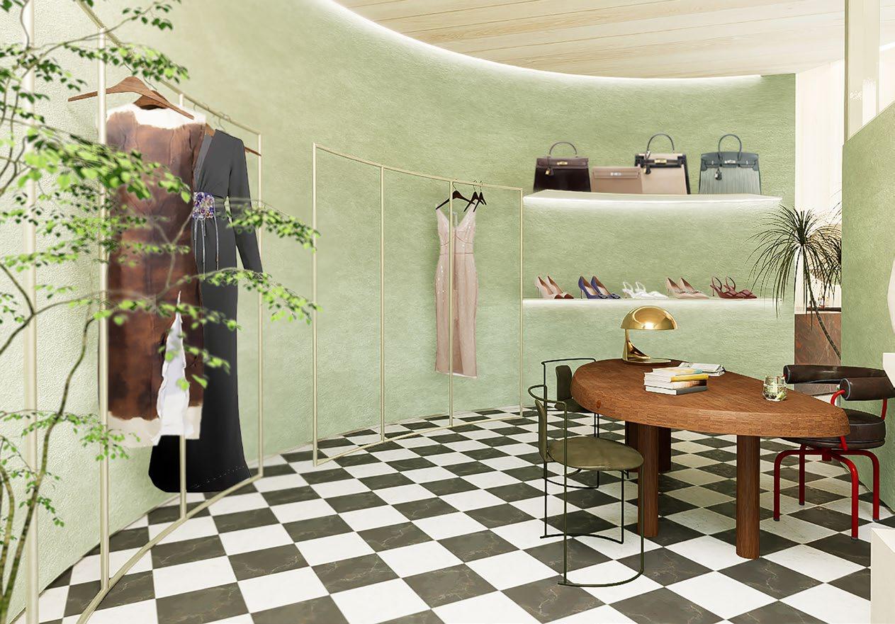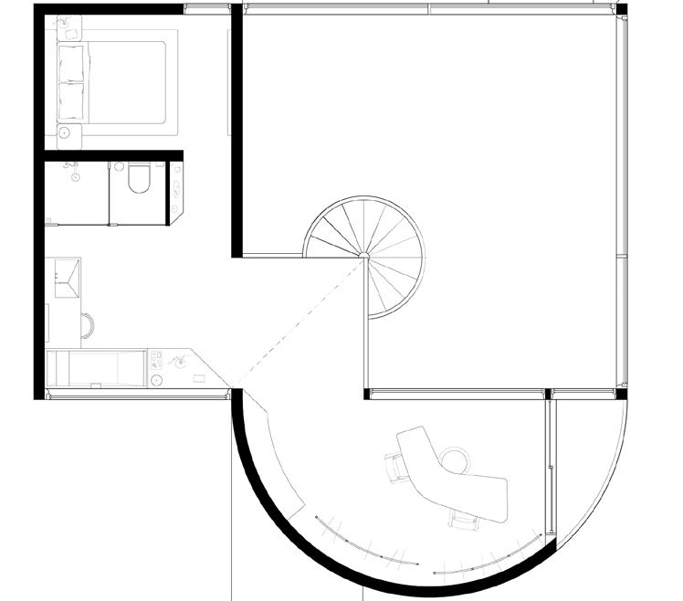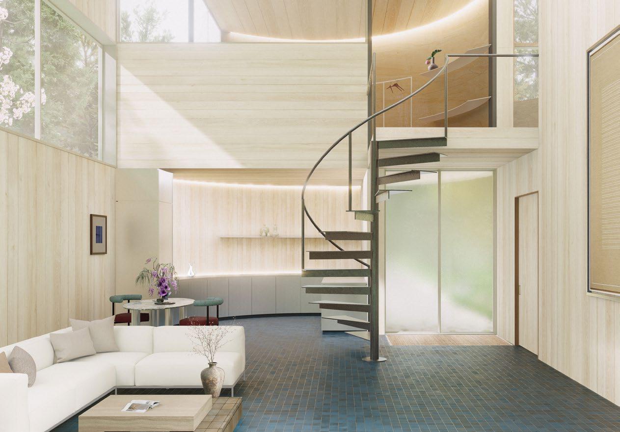 The cylindrical volume, originally conceived as troom, transforms into a light-filled sanctuary mirrors its owner’s journey from runway to board room. For our client, a former model who now new talents through her agency, this space becomes more than just an office – it’s a carefully choreo graphed setting where fashion, business, and history intertwine. Generous windows capture breezes and views, while a custom hanging system follows the room’s gentle arc, displaying carefully rated pieces like an art installation. The space both function and poetry – curved rails float along walls, their brass finish catching afternoon light, furniture can be easily rearranged to transition focused work sessions to intimate industry gatherings. The sculptural spiral staircase – takes on new ing here, its skeletal form becoming an impromptu runway. The space transforms into a theater of moments: models practicing their walks, confidential portfolio reviews, or casual gatherings with industry friends. In this thoughtful adaptation of Gwathmey’s vision, the interior becomes both stage and sanctuary.
