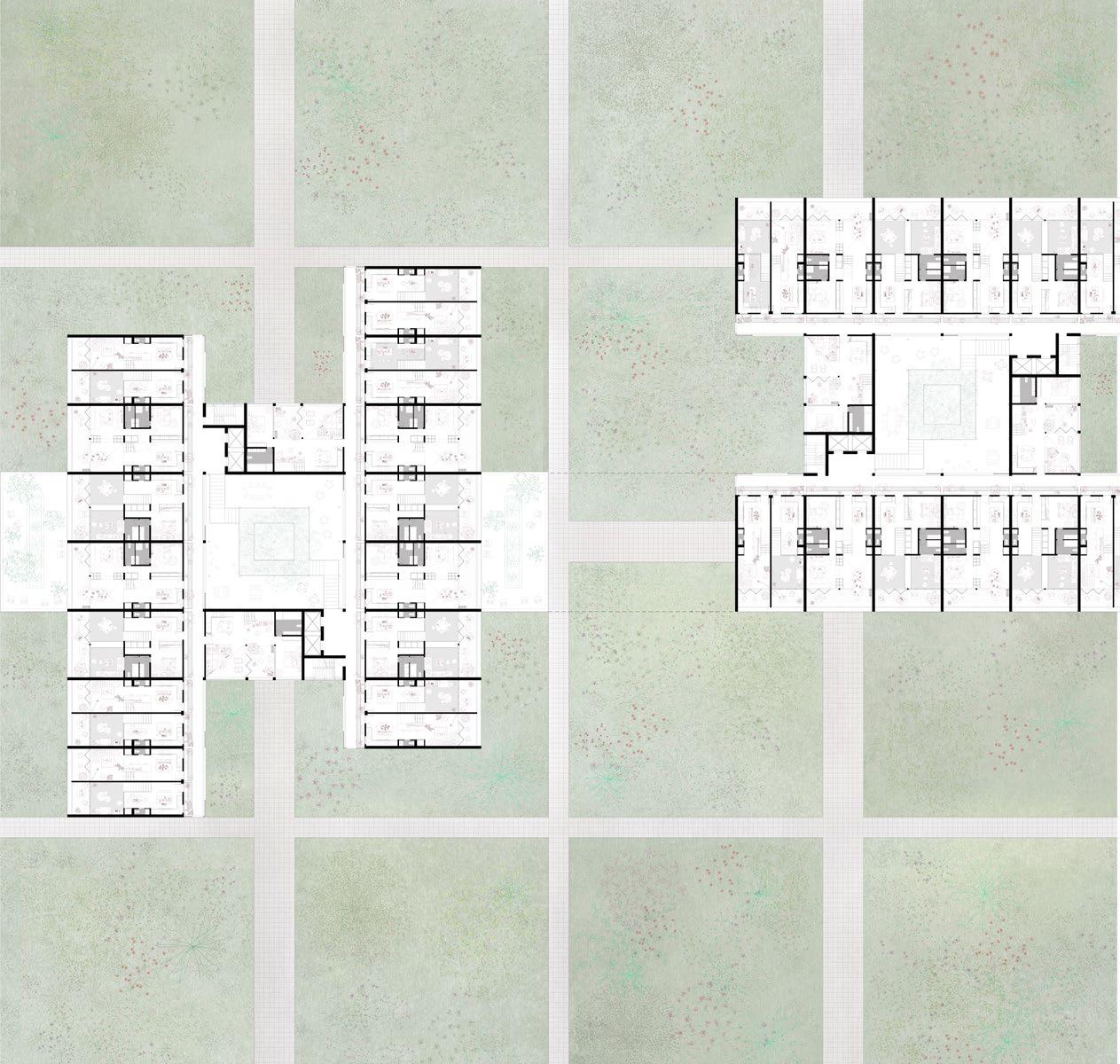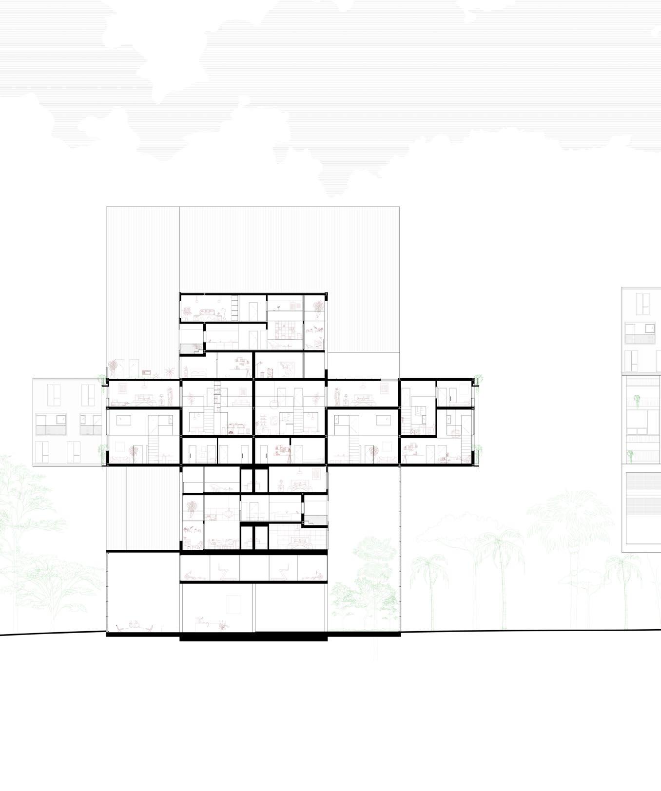 The project employs a sophisticated Vierendeel truss system that elevates the residential mass, simultaneously maximizing ground porosity and providing flood resilience. This structural framework, integrated with a skip-stop circulation scheme, creates an efficient living apparatus served by dual vertical cores that connect to four primary corridors, providing access to all units and shared spaces. The system’s modularity and structural logic suggests a metabolic structure—responding to changing urban needs through systematic growth and adaptation.through systematic growth and adaptation.