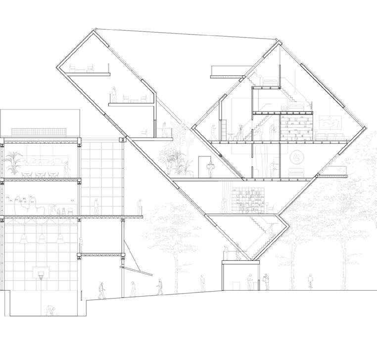 The building transforms into a hybrid civic-residential complex where public amenities and living spaces coexist vertically. The ground level houses community programs – sports facilities, a library, and gathering spaces – while residential units are elevated above, creating an urban arrangement where daily life flows seamlessly between public engagement and private dwelling. This layered organization promotes a new model of communal living