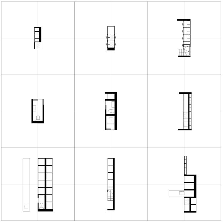 The central service core orchestrates the living space through a pinwheel arrangement, where four distinct zones radiate from a compact ‘machine for living’ that houses essential utilities. Each surrounding space maintains its identity through subtle architectural cues – changes in floor materiality, lighting conditions, and spatial proportions – while remaining functionally ambiguous. Built-in elements like window seating, storage walls, fold-down surfaces, and sliding panels enable residents to modify these zones (day, night, work, and quiet) according to their needs, while the absence of conventional doors creates a continuous spatial experience where activities naturally flow and overlap.
