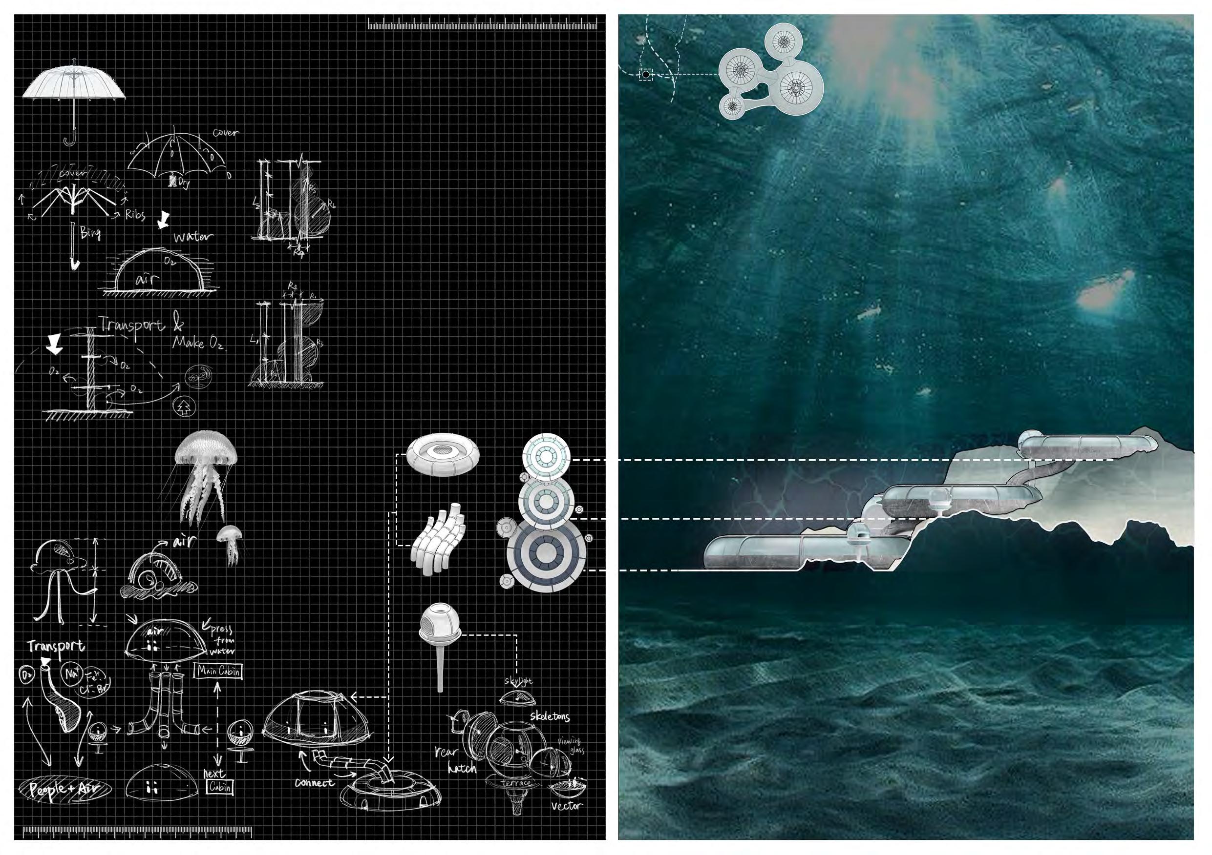 Solving the problem of human's inability to survive underwater, showing the oxygen supply system of the underwater city, the system is roughly divided into three layers, the top layer is the support of the entire air mould support, down to the second layer and the bottom layer is the main part of the oxygen production.