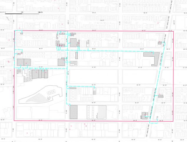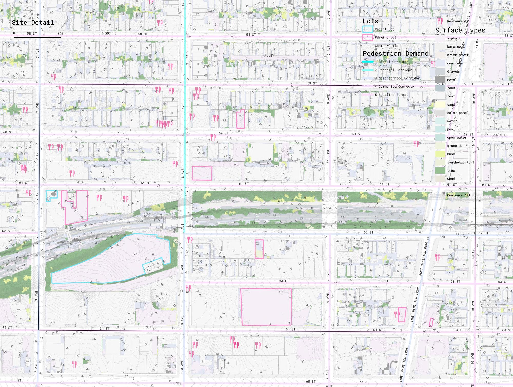 The pink lots are parking lots, and the blue lots are vacant lots. The largest one is a parking lot under construction. These sites are possible sites for community cardens The colored road center lines are the pedestrian demand of the streets, we can see the 8th Avenue is of the highest demand. The 62 St is also of high demand. These demonstrates that the site requires improvement on its street quality.