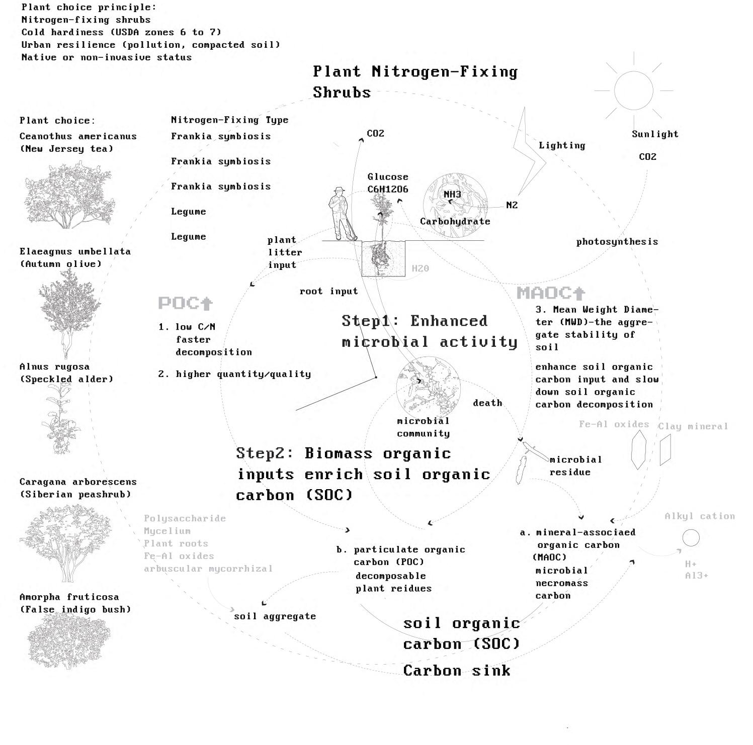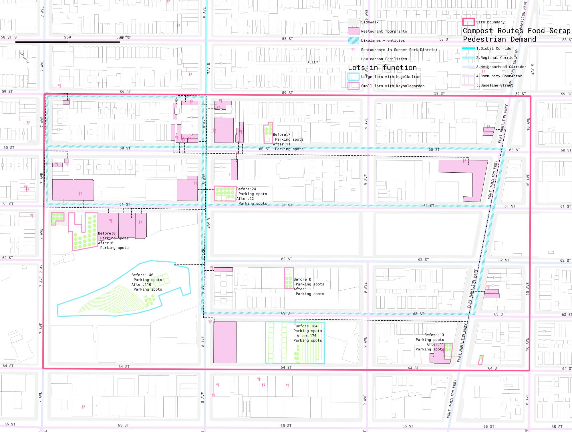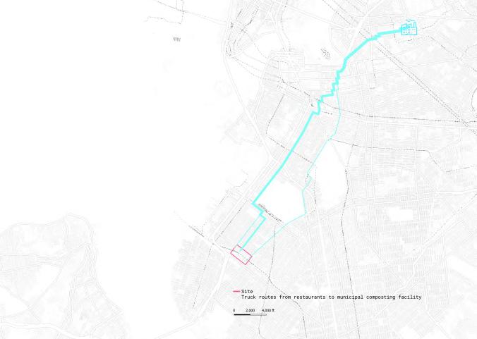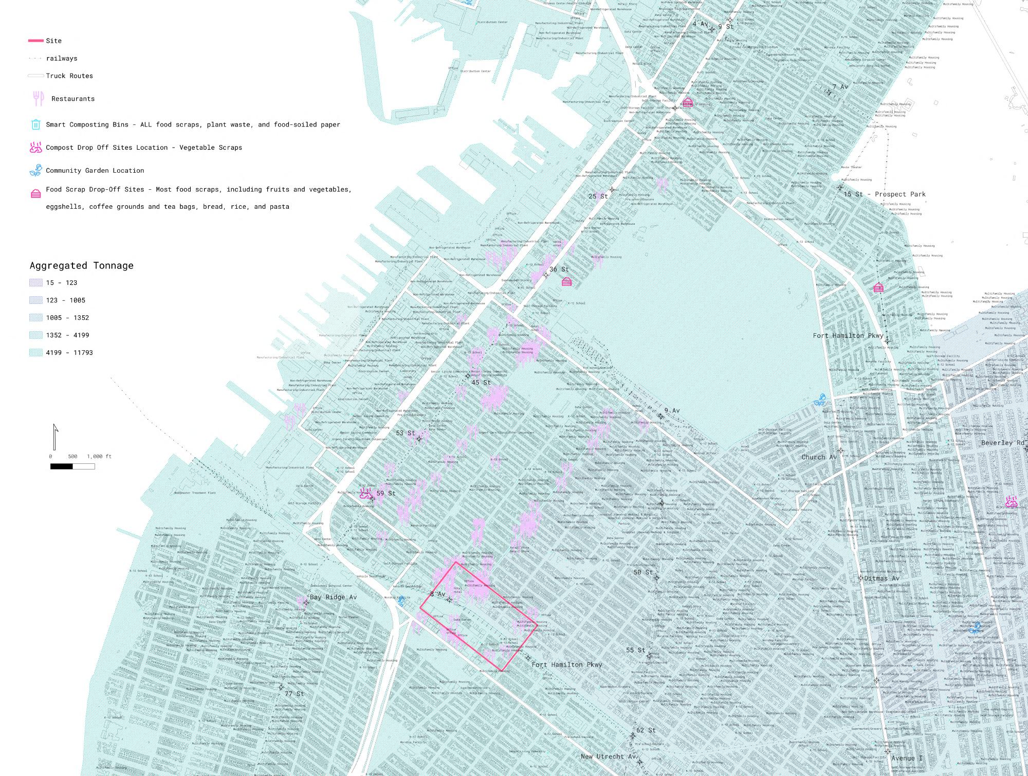 Carbon emissions are a major contributor to global warming and sea level rise, making their reduction a critical priority in addressing climate change. These emissions include carbon dioxide, carbon monoxide, and volatile organic compounds (VOCs). New York City offers a compelling case study for examining urban carbon emissions due to its detailed GIS data and complex urban systems. As part of its broader goal of achieving carbon neutrality, NYC began enforcing citywide curbside composting on April 1, 2025—an important step toward diverting organic waste from landfills and reducing methane emissions. However, the transportation of food waste to centralized processing facilities—such as the Staten Island Compost Facility, the Varick Facility in Brooklyn, and out-of-state sites—continues to generate significant carbon emissions[1][2]. The civilians are also reluctant to separte food scraps seeing no feedback from this act. This challenge presents an opportunity to leverage landscape architecture solutions, such as decentralized community composting, to reduce transport-related emissions. This scale change of food scrap dealing would encourage the residents and local restaurants to do the food scrap separating and composting by seeing the district beautified and harvesting vegetables and fruit through the process.