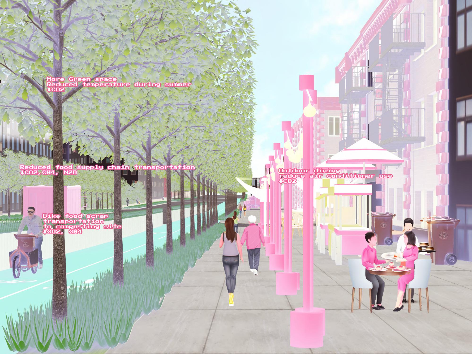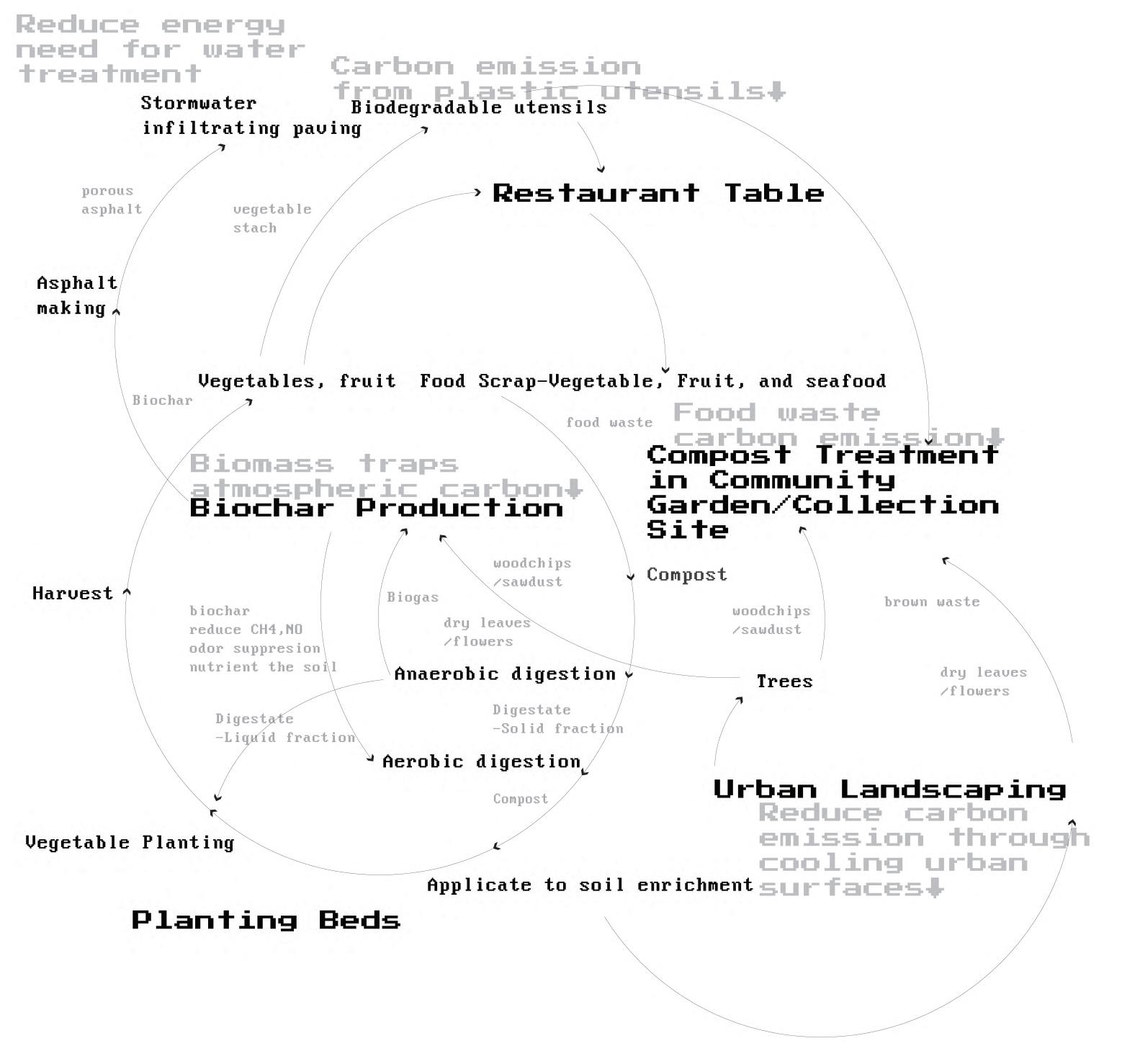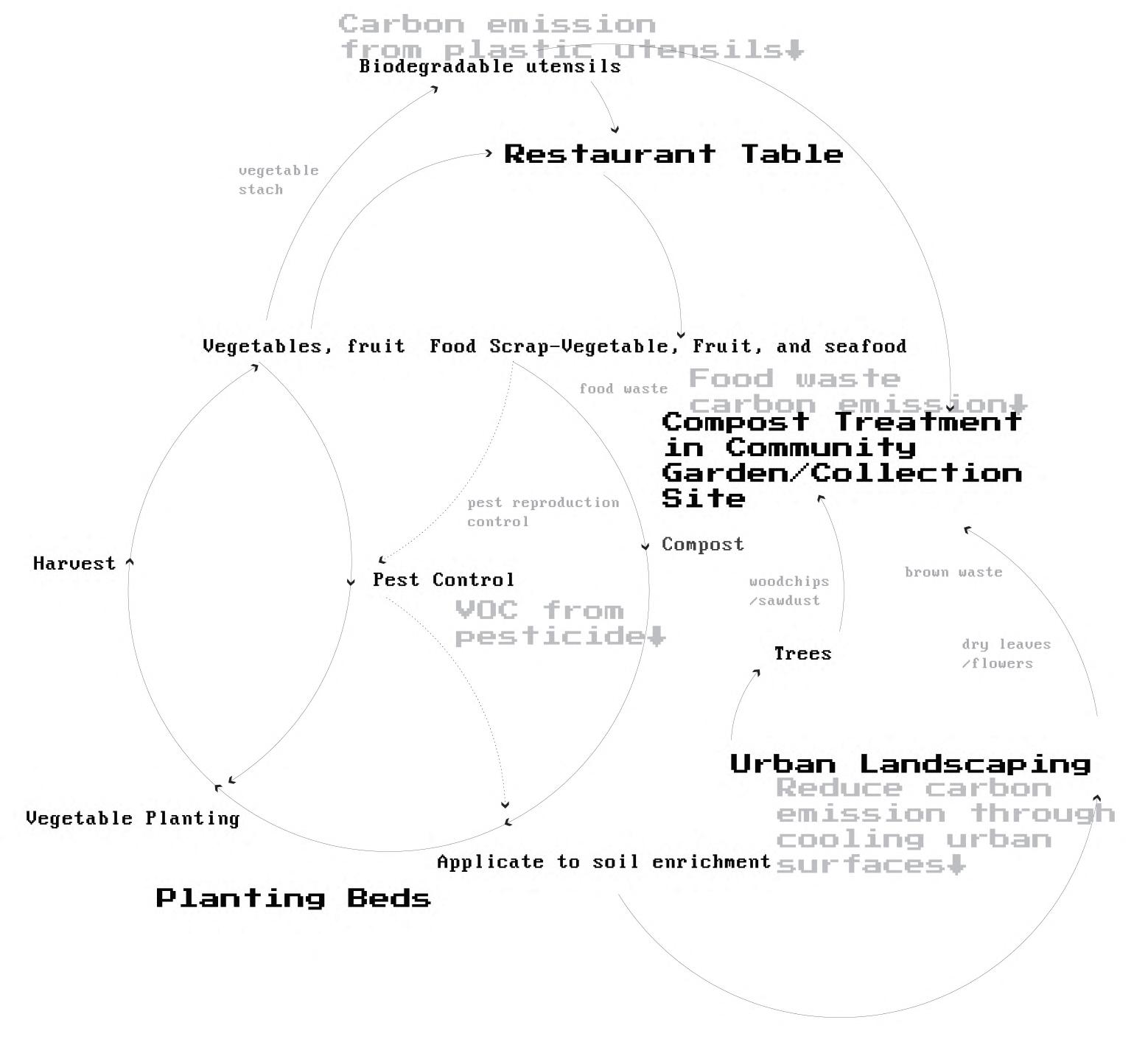 This project utilizes landscape architecture to reduce the carbon emission of restaurants by employing carbon sequestration techniques. By using compost gardens that shorten the transportation route of compost, new local food sources are created which replace food shipped from afar. The gardens are placed on roofs and at ground-level. The gardens also provide materials to produce organic pesticides that replace traditional pesticides, thereby reducing the release of carbon intensive VOCs. The compost gardens are implemented in existing parking lots and vacant lots and are connected in a community garden network. The proposed renovation of streets increases carbon sequestration through street-side vegetation. These interventions help alleviate the urban heat island effect, improve the micro-climate, and consequently, reduce the energy consumption associated with air-conditioning use in buildings.