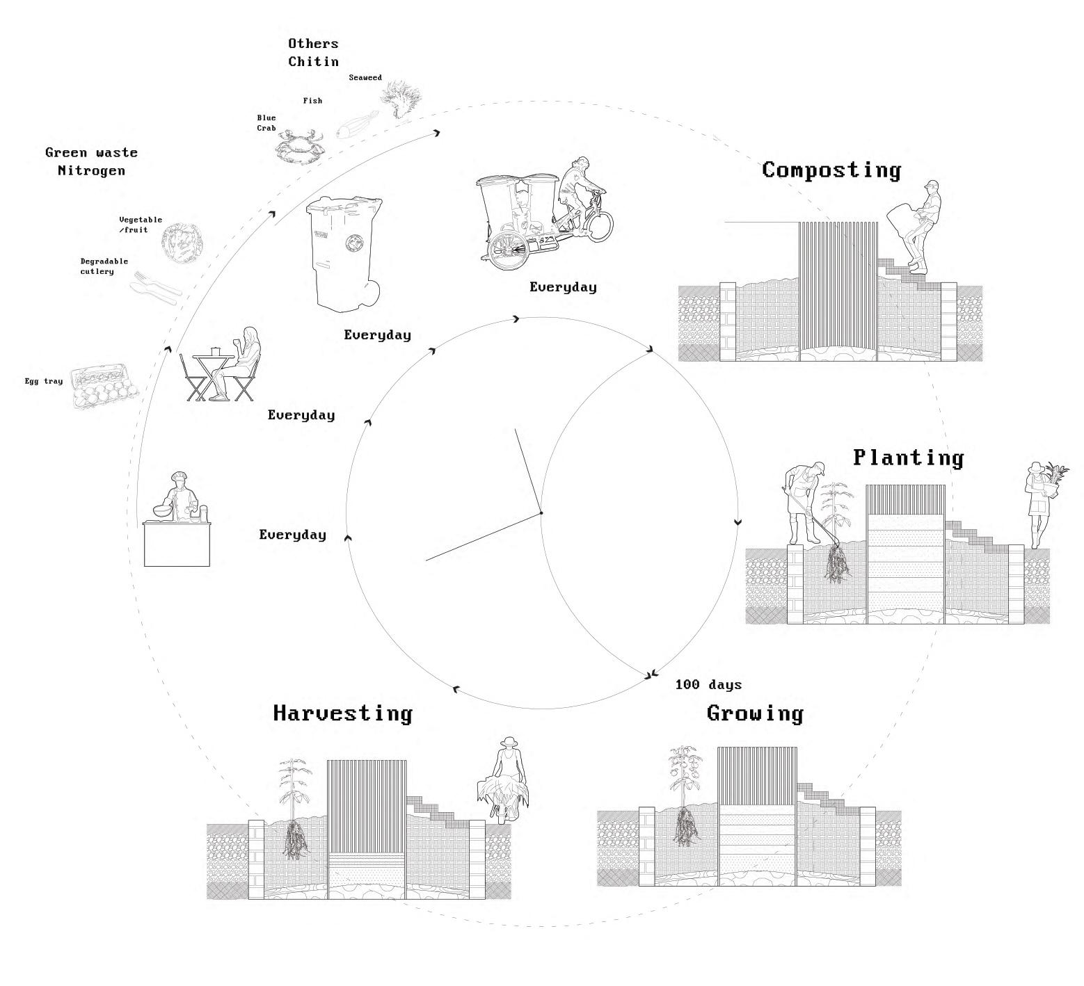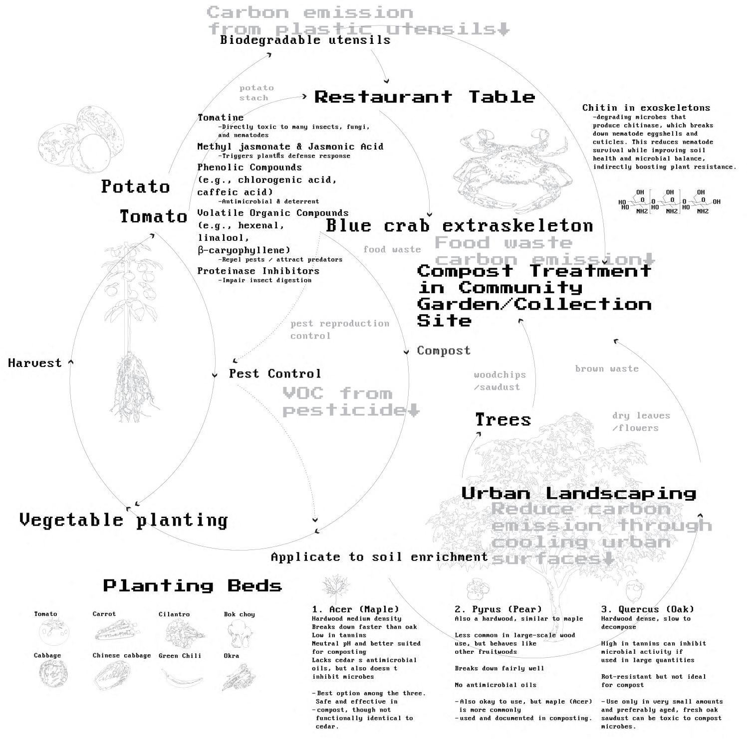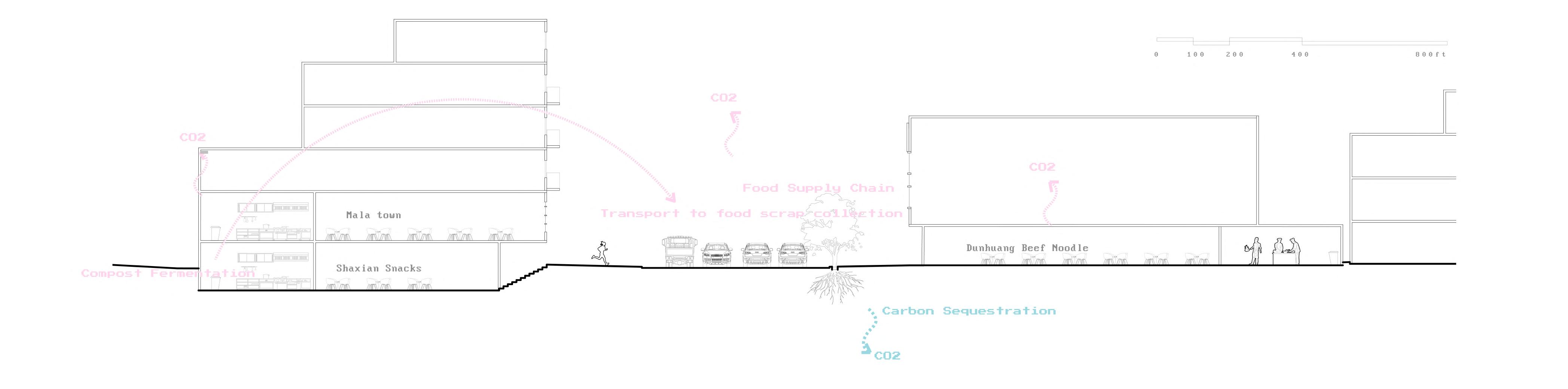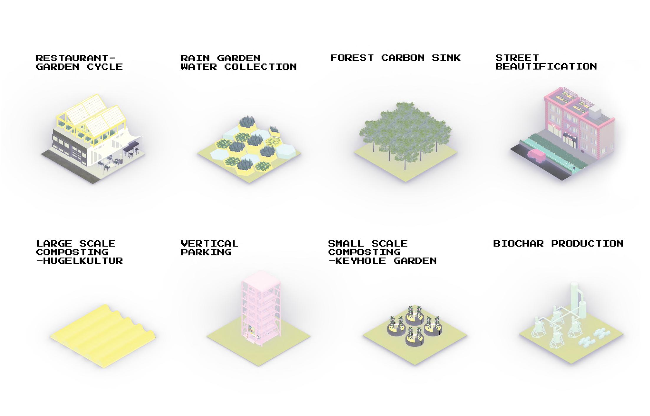 This project utilizes landscape architecture to reduce the carbon emission of restaurants by employing carbon sequestration techniques. By using compost gardens that shorten the transportation route of compost, new local food sources are created which replace food shipped from afar. The gardens are placed on roofs and at ground-level. The gardens also provide materials to produce organic pesticides that replace traditional pesticides, thereby reducing the release of carbon intensive VOCs. The compost gardens are implemented in existing parking lots and vacant lots and are connected in a community garden network. The proposed renovation of streets increases carbon sequestration through street-side vegetation. These interventions help alleviate the urban heat island effect, improve the micro-climate, and consequently, reduce the energy consumption associated with air-conditioning use in buildings.