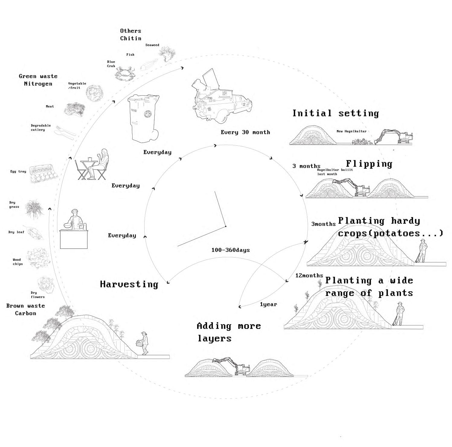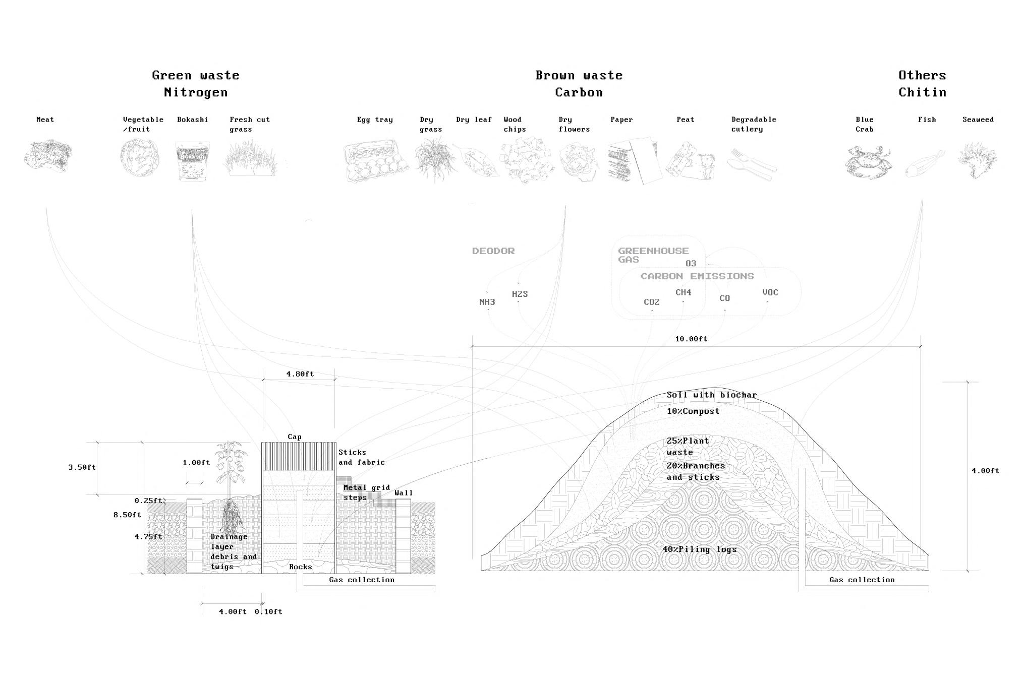 This project explores low-carbon urban adaptation through site-specific composting strategies in a high-emission, restaurant-dense district. By analyzing GIS data across city, neighborhood, and site scales, the study identifies key contributors to carbon emissions, including high food waste generation, limited green infrastructure, and insufficient sustainable design. The research employs tools such as QGIS, Python, and Rhino to construct a comprehensive spatial and volumetric understanding of the site. Through mapping, modeling, and diagramming, the study proposes a compost-centered strategy to mitigate methane emissions and enhance environmental performance. This approach positions composting not only as a waste management solution but also as a catalyst for broader ecological integration within the urban fabric.