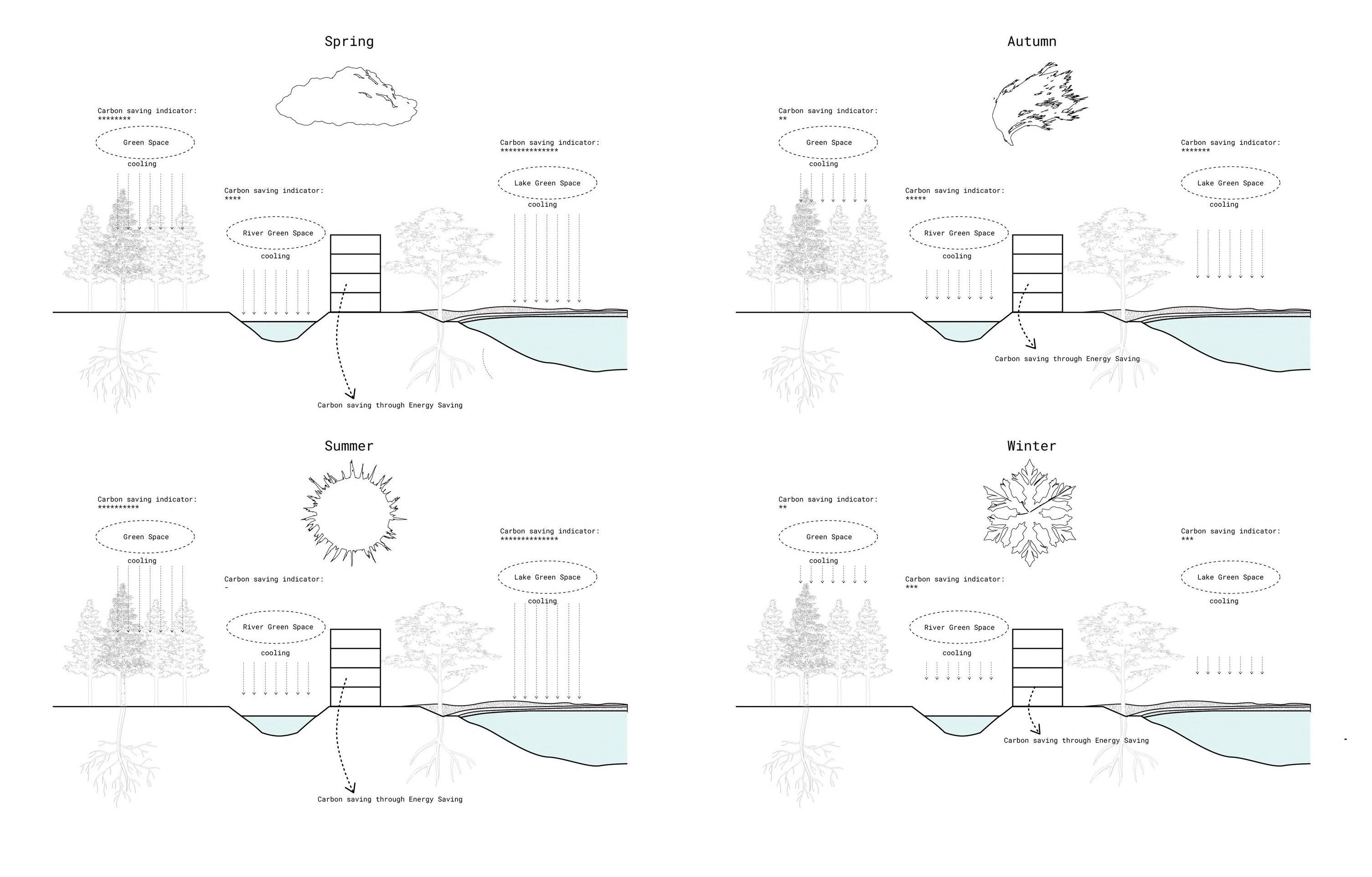 The third way to deal with carbon emission is through research for guidance for landscape and urban design. This research evaluates the cooling and carbon reduction capabilities of Urban Blue-Green Spaces (UBGS) in a high-density northern Chinese city, focusing on green spaces, river green spaces, and lake green spaces. Key indicators include Cooling Intensity (CI), Cooling Distance (CD), and Cooling Carbon Reduction (CS). Findings reveal that average Land Surface Temperature (LST) significantly affects UBGS functions, with green spaces showing the strongest carbon reduction in summer and spring. Lake green space outperforms river green space in summer and spring but falls short to river space in autumn and winter. It shows that an effective way of reducing carbon emission is through cooling by increasing green space.