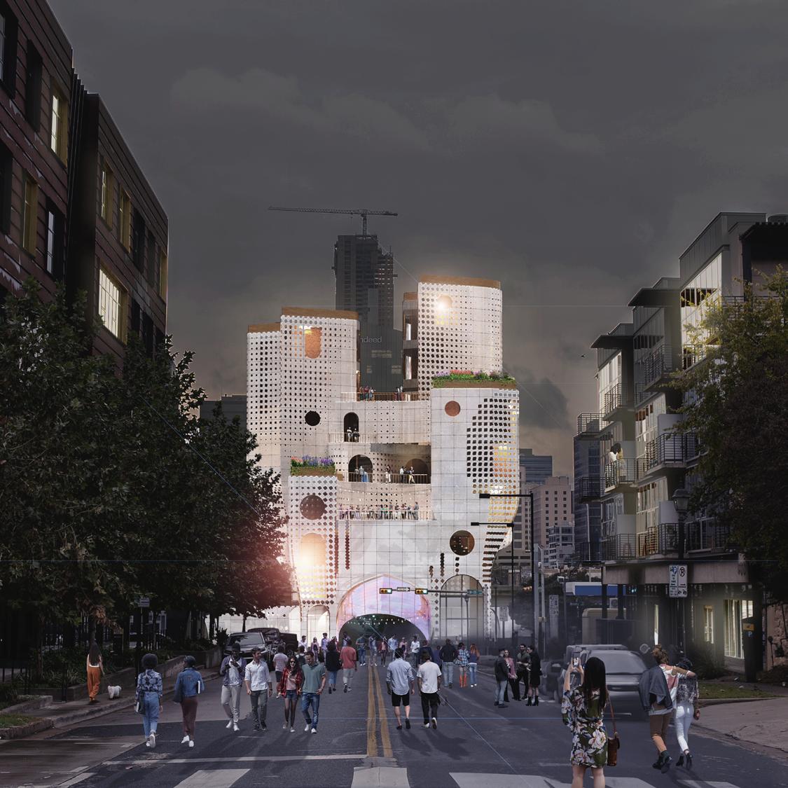 Sixth Street and Interstate 35 are arguably Austin’s heaviest foot and motor traffic infrastructure respectively. Currently in this intersection, I-35 dominates the site and leaves the human movement in a lower priority in safety, and comfortability. “six35” is a mixed-use “bridge” over and under I-35 to create a barrier between the motor traffic and the foot traffic. With six35, we aimed to create a balanced relationship between both mediums of movement.