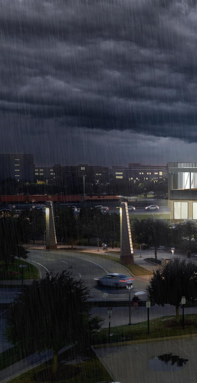 This proposal for the Aggieland Visitor Center pushes the structural capabilities of the cantilever. The 70 foot cantilever creates elevated spaces above and shaded greenspace below.