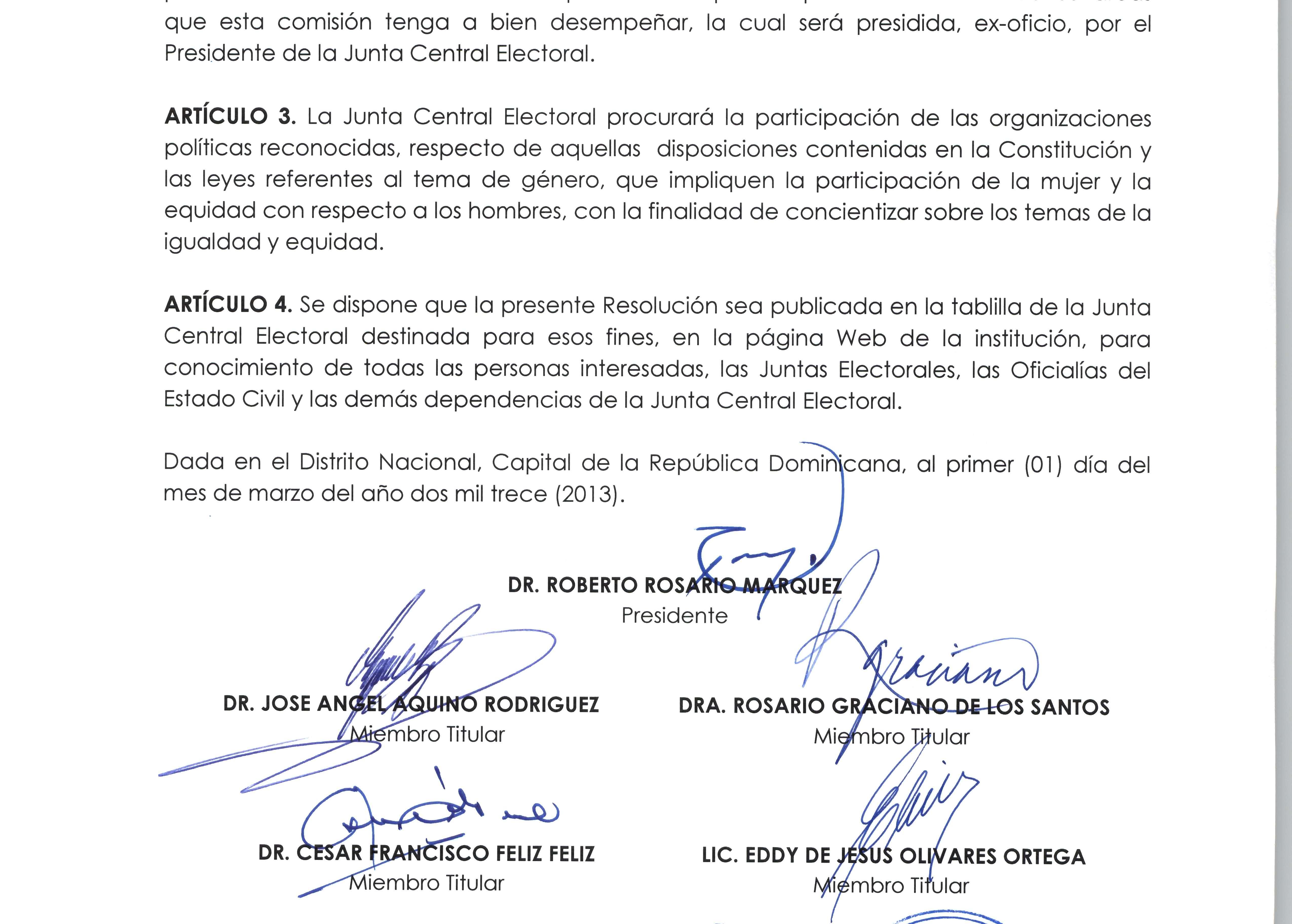 CONSIDERANDO: Que a partir de la declaration de compromisos que resultaron de la Mesa Permanente de Genero y Participation Politics, desarrolladas en la Escuela de Formacion Electoral y del Estado Civil de la Junta Central Electoral, el 23 de febrero del 2010, la institucion se comprometio, conjuntamente con las organizaciones politicas debidamente representadas en dicho evento, a fiscalizar y dar cumplimiento a la Constitucion y las leyes en lo concerniente a la presentacion de candidaturas a favor de la mujer.