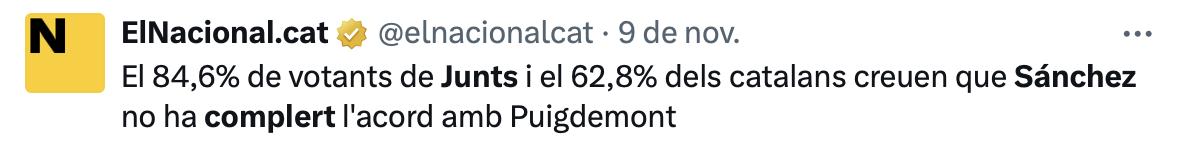 També ha recordat que molts catalans pateixen directament aquests incompliments: autònoms amb quotes més altes, famílies sense habitatge assequible, usuaris de Rodalies que arriben tard cada dia i pescadors abandonats davant les restriccions europees. “El problema dels catalans no són les promeses, són els incompliments. Vostè no ha complert i, per tant, menteix”, ha sentenciat. Només tres de cada deu catalans consideren que Sánchez ha complert l’acord amb Junts, ha afegit.