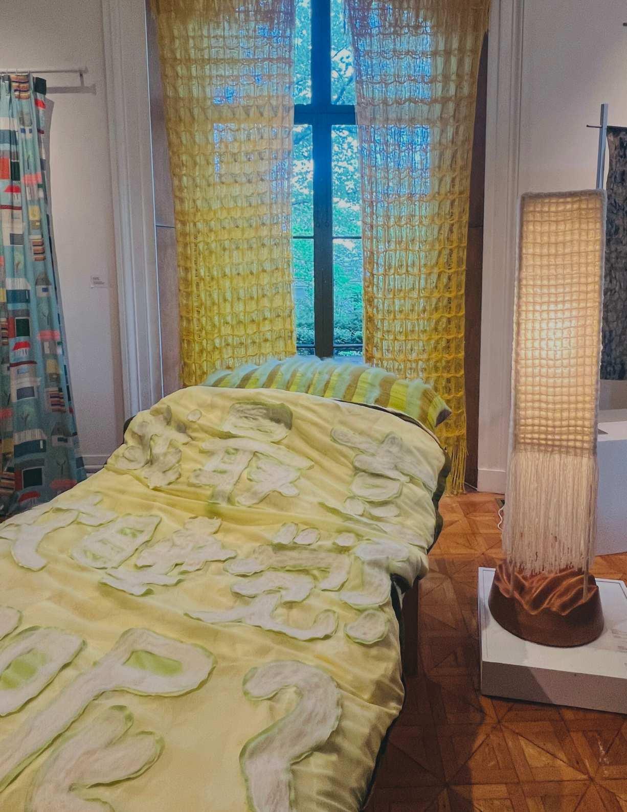 The pillowcase is made from a single piece of pocket jacquard fabric, flipped inside out. Its special structure, with spaced warps, makes the surface fabric flowy and soft, mimicking the effect of waffle weave. Hand-felted text on the quilt reads, “I like sleep the most, and you?” This playful and whimsical statement serves as the anchor piece for my entire collection.
