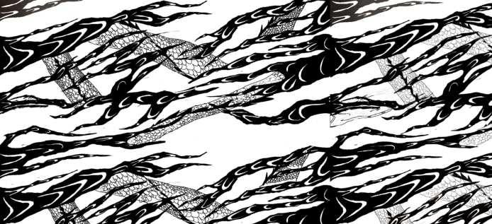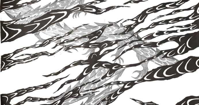 The paper-cut form of cloud is inspired by Chinese shadow play, aiming to depict clouds encompassing the environment. Dragons swoosh in between that intrigue viewers to trace of heads and ends but they can’t. The mysterious existence of dragon and thick cloud create an ominous atmosphere which is the opposite of the most context of dragon patterns -- fortune, power and brightness.