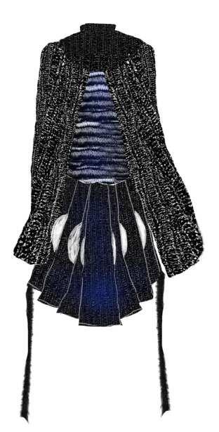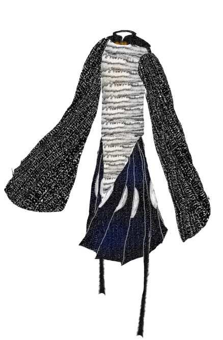 Swallow has distinguishable long tail to maneuver its 昀氀ying. Its dark glossy-blue backs strongly contrast to pale, softer underpart. A splash of orange throat adds vitality to this little agile creature. Swallow anatomies are reference to the textile structures and shapes. My objective is to design and create a costume to dress up people as a swallow.