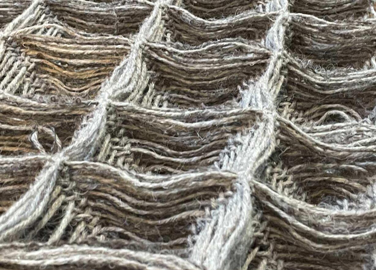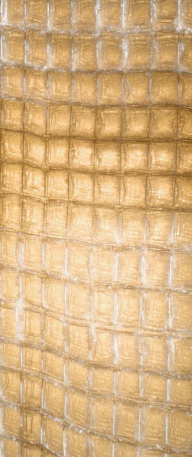 The unique structure of the waffle weave allows the textile to interact dynamically with light, sound, and air, making it an organic, breathing piece that integrates seamlessly into interior spaces.