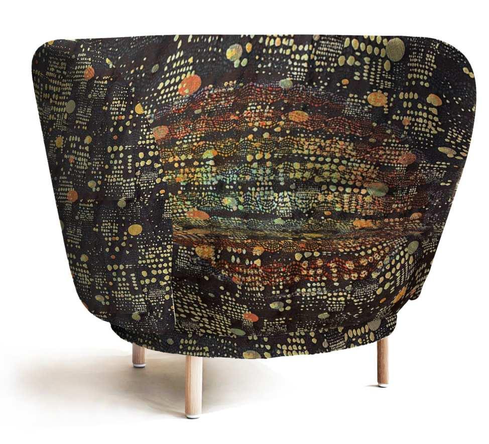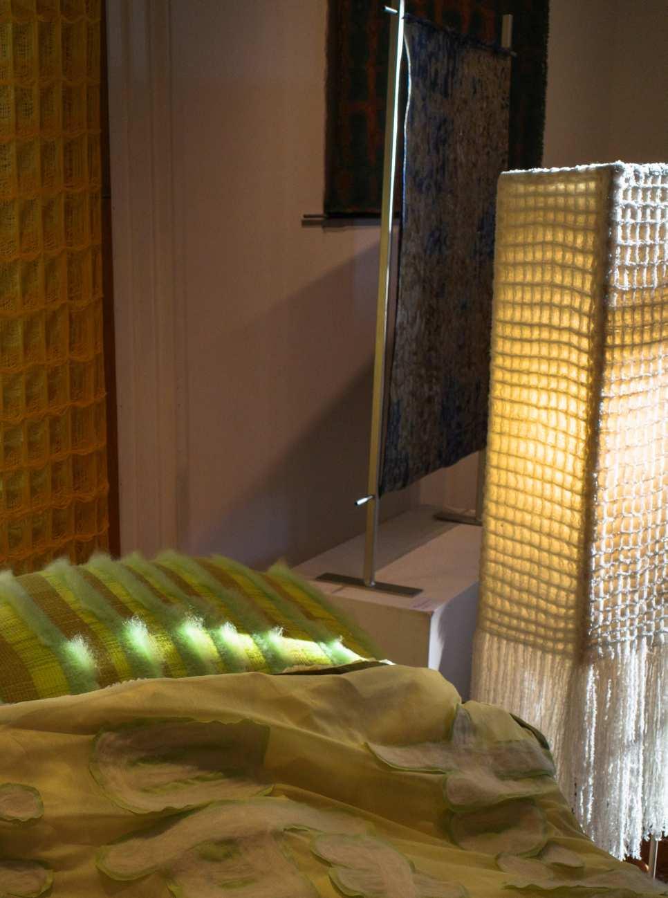 I choose wool primarily for its inherent porous structure, which proves highly effective in absorbing sound. Employing speci昀椀c weaving techniques, such as triple cloth and de昀氀ective weft, allows me to generate crumples and layers within the textile, enhancing its sound-absorption capabilities. Wool possesses 昀椀re-retardant properties, ensuring safety in interior spaces. The remarkable softness of wool is accentuated as I transform the textiles into more volumetric forms compared to conventional textiles.