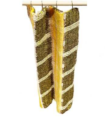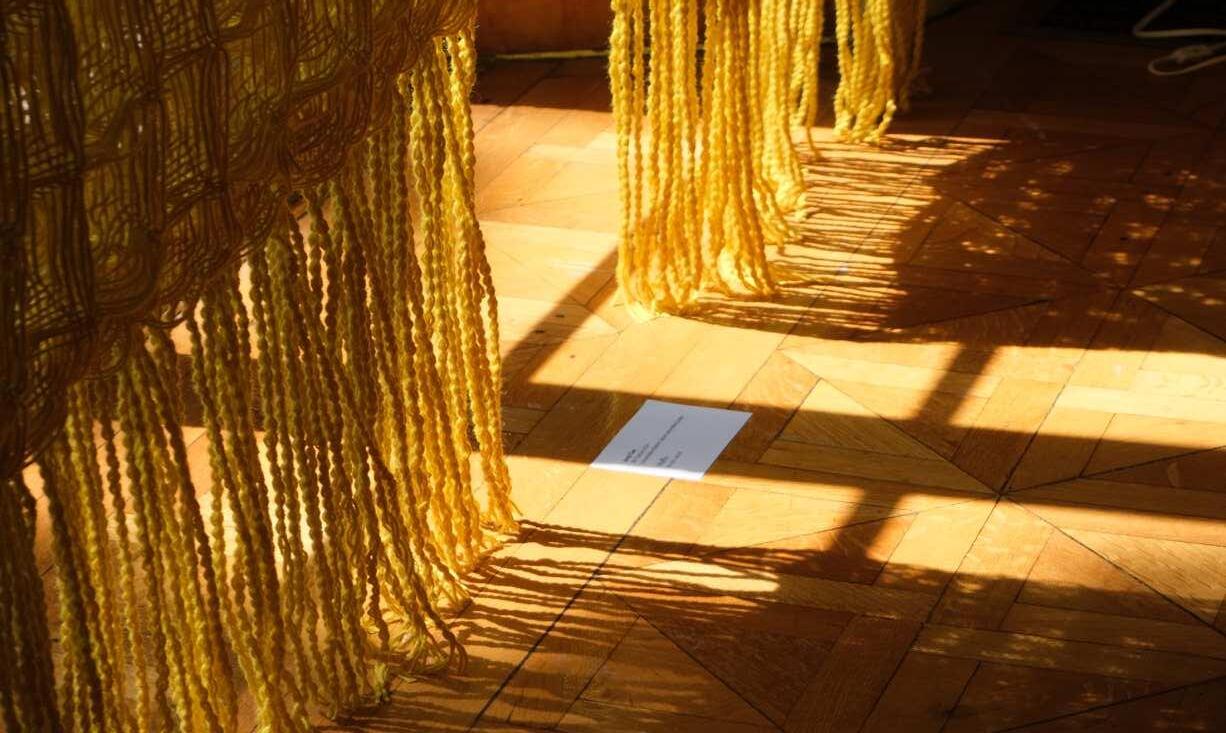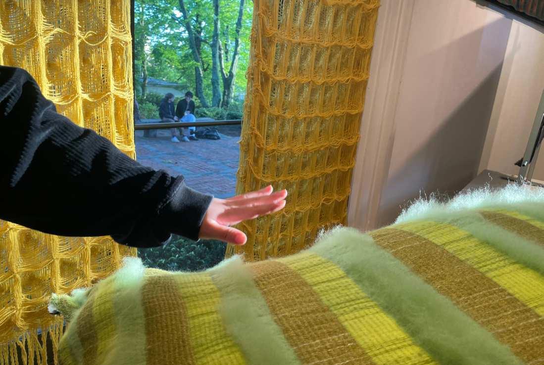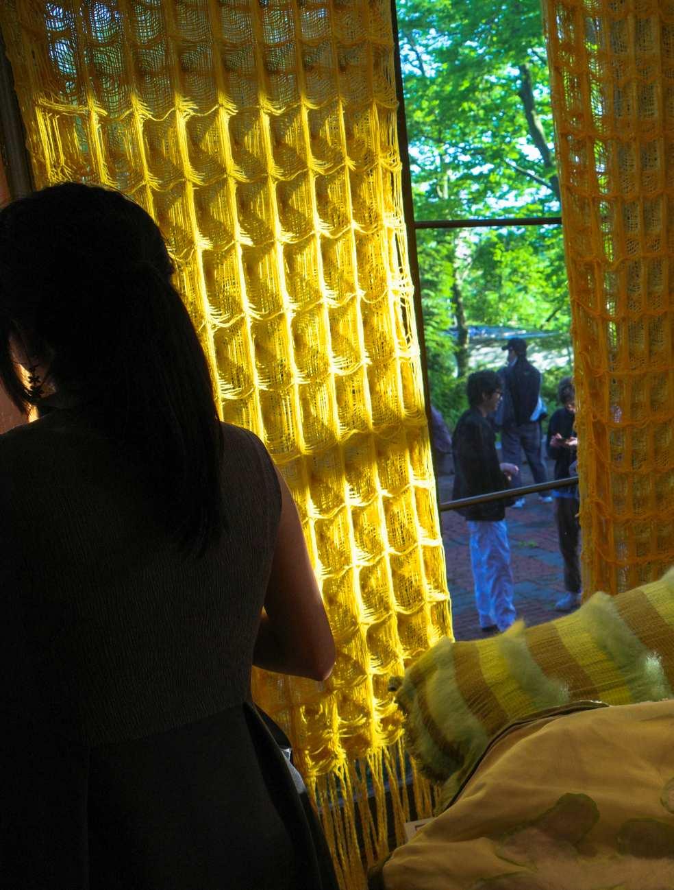 I conducted a full-length test with a different yarn that has an attractively raw quality. This yarn shrinks and puffs after washing. For my final piece, I chose a slightly thinner yellow acrylic yarn that better aligns with my color scheme and concept. The linear quality of the final piece is more breathable and less substantial when placed in front of the window.